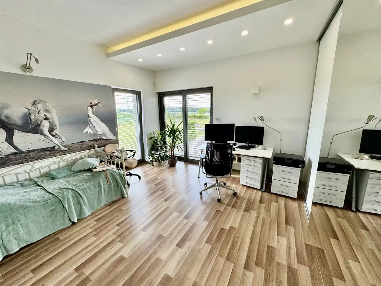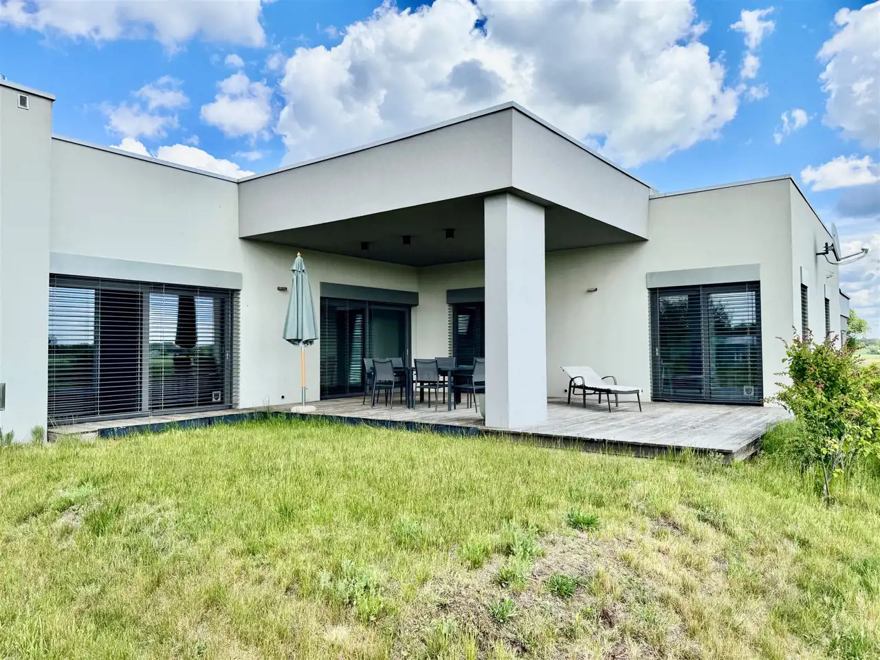 Na sprzedaż przestronny, nowoczesny dom z dwustanowiskowym garażem o powierzchni 189 m², położony na dużej ponad 14 arowej działce. Budynek parterowy z dachem płaskim, wybudowany w 2015 r, dostępne instalacje to: wodna, kanalizacyjna, energetyczna, mini rekuperacja w pomieszczeniach sanitarnych, garderobie oraz w pomieszczeniu gospodarczym, system alarmowy. Nowoczesne rozwiązania techniczne, ogrzewanie podłogowe, okna aluminium z pakietem trzyszybowym, zewnętrzne żaluzje regulowane elektrycznie.