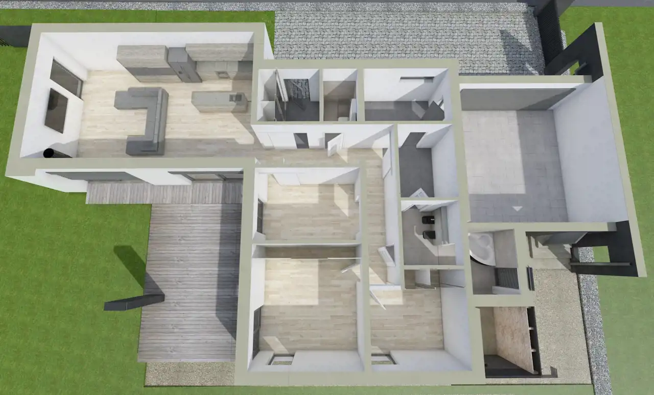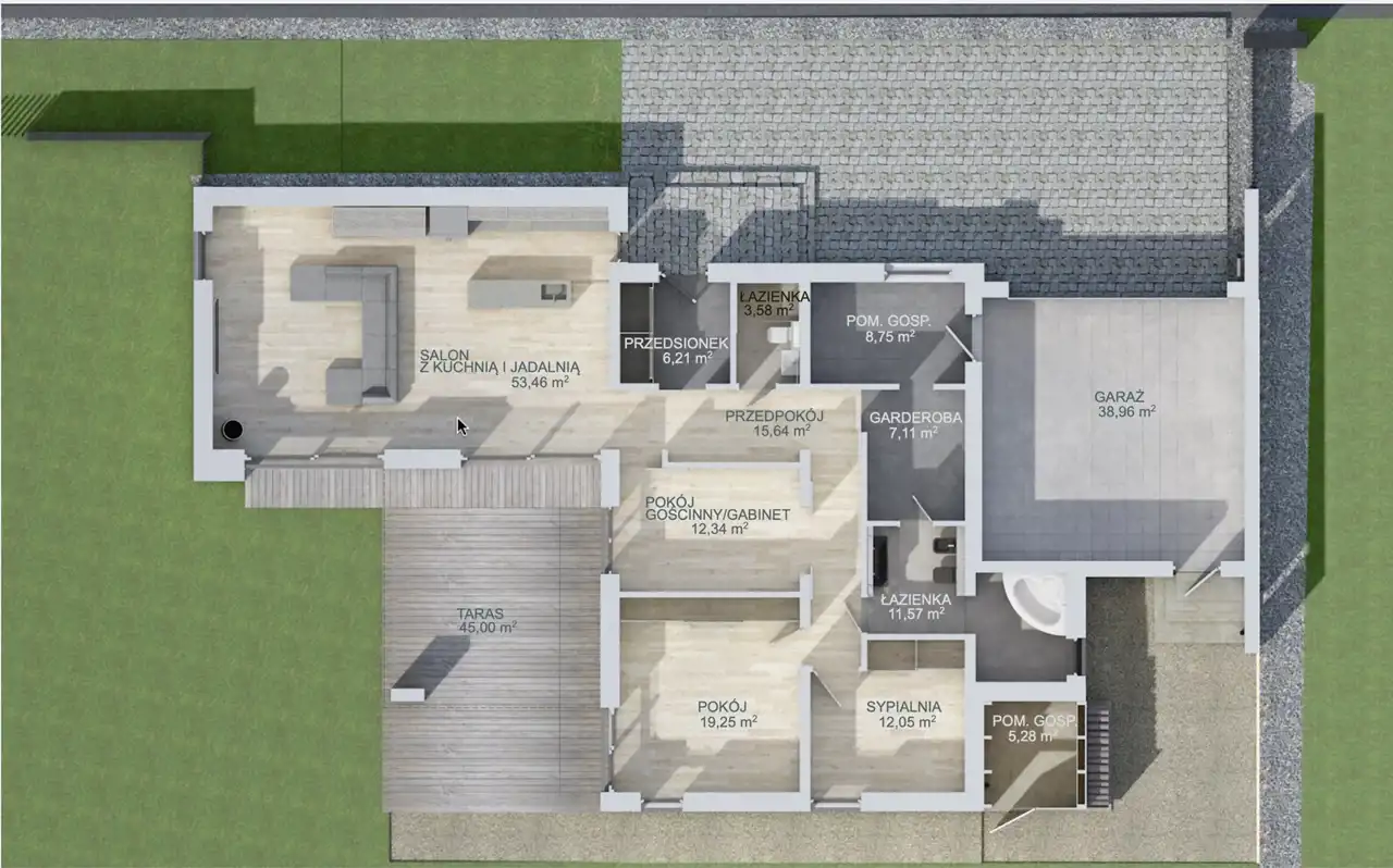 Przestronny salon z otwartą kuchnią (53,4m2) – serce domu z dużymi przeszkleniami, zapewniającymi dostęp do naturalnego światła i bezpośrednie wyjście na duży taras (45m2), idealny na poranną kawę, spotkania rodzinne lub letnie grillowanie,