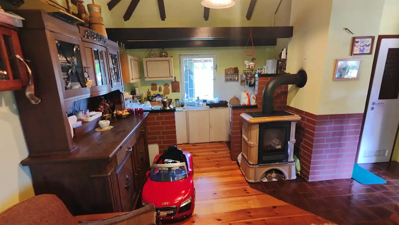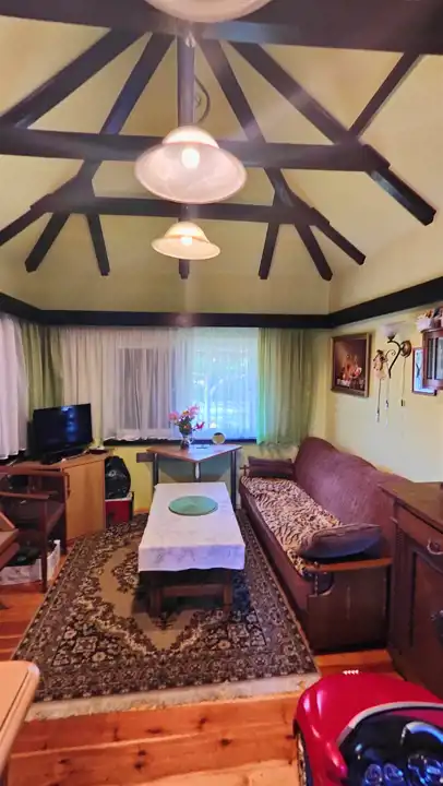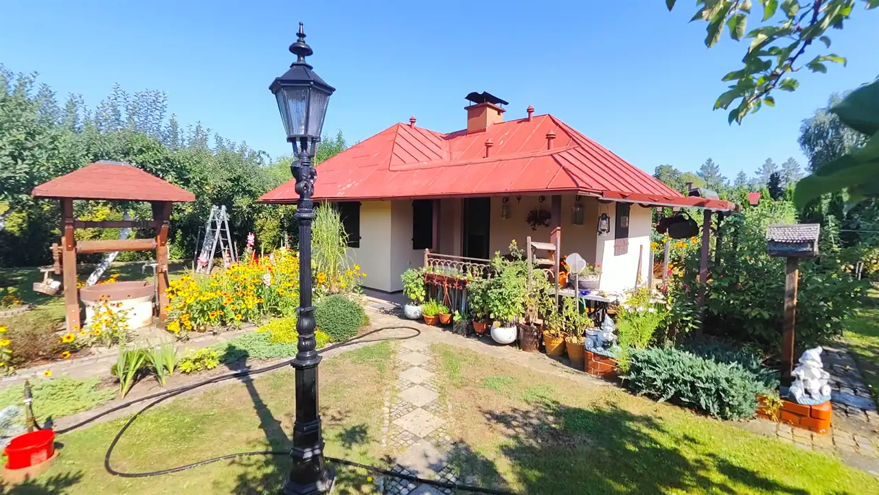 Funkcja budynku: wiatrołap, pokój dzienny z aneksem kuchennym, komunikacja, sypialnia, łazienka połączona z wc, piwniczka wyposażona m.in. w wędzarnik, poddasze. W centralnej części piec typu "koza". Dodatkowym atutem jest zadaszony taras z miejscem na relaks i biesiadowanie. Dodatkowo na terenie działki wiata jednostanowiskowa na postojowanie samochodu.