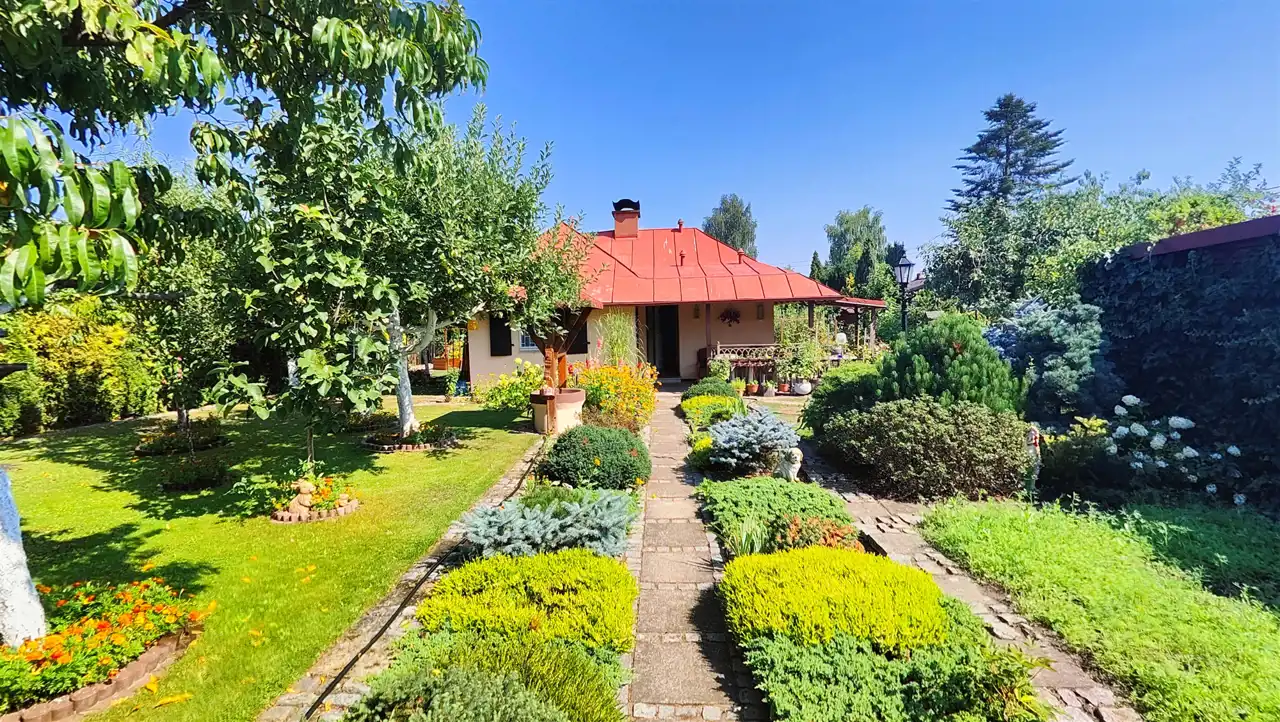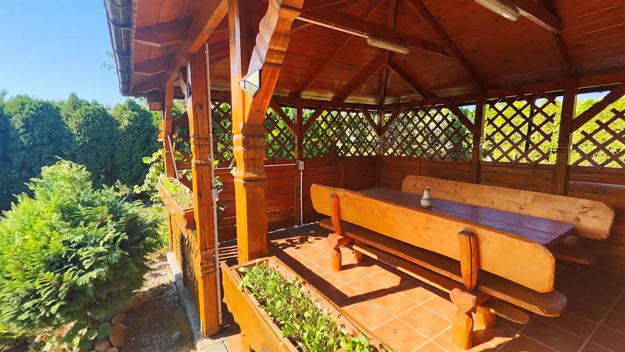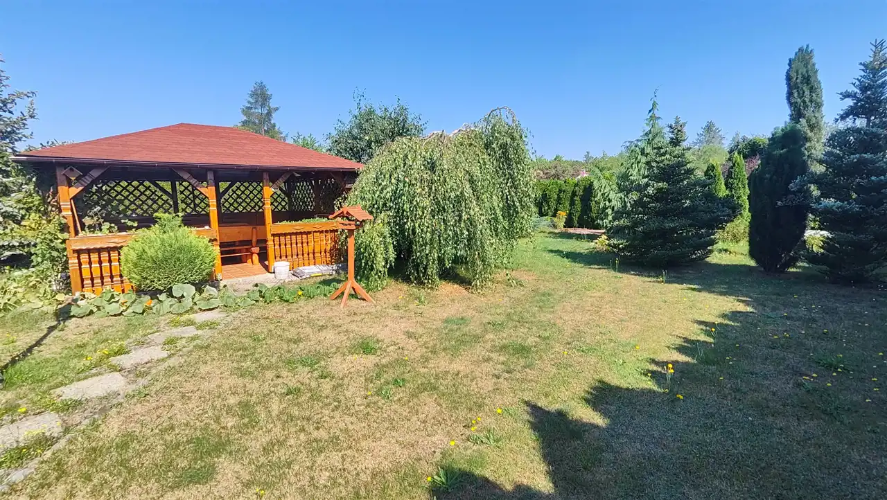 Część ogrodowa/uprawna zabudowana budynkiem o powierzchni 35 m2, z pięknym, zadaszonym tarasem o powierzchni około 12 m2. Budynek murowany, wzniesiony w technologii tradycyjnej, częściowo podpiwniczony, kryty dachem wielospadowym o konstrukcji drewnianej, pokrytej blachą. Dodatkowo spora powierzchnia na poddaszu do wykorzystania wg własnej koncepcji.