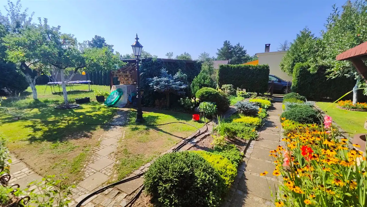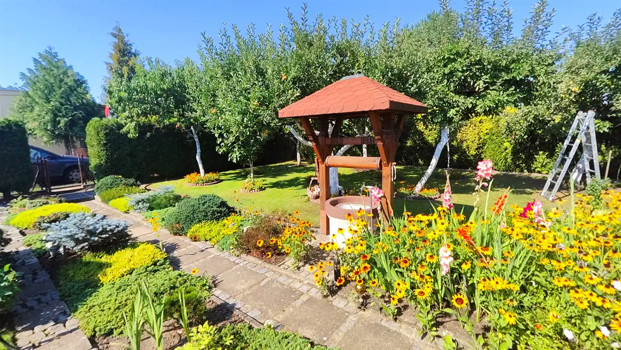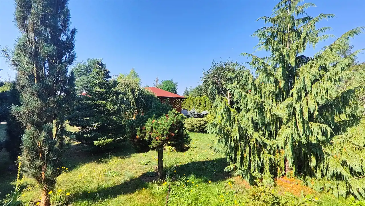 Działka z zadbanymi grządkami warzywnymi, licznymi nasadzeniami w postaci drzew i krzewów owocowych oraz ozdobnych, duże drzewa, krzewy, tuje żywopłoty, zadbana zieleń, pielęgnowana od lat przez aktualnych właścicieli (trudny do wyceny koszt roślin i nakład pracy!!). Części komunikacyjne wyłożone kostką, uzupełnione zadbanym trawnikiem, dodatkowo na terenie działki ozdobne oświetlenie, system nawadniania, własne studnie, doprowadzony prąd.