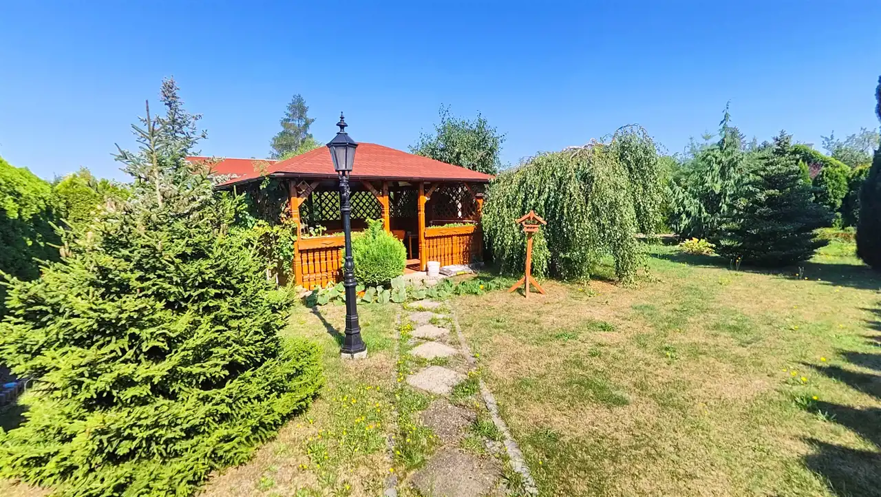 Część rekreacyjna z dorodnymi azaliami, drzewami ozdobnymi dającymi cień w upalne dni i tujami odgradzającymi od sąsiednich działek, dającymi poczucie intymności, zadbany trawnik oraz przestronna wiata ogrodowa stanowią idealne miejsce dla spotkań i relaksu. idealna enklawa do uprawy roślin i relaksu, a nawet do zamieszkania przez większą część roku. Nieopodal stawy rybne, jeziorka.