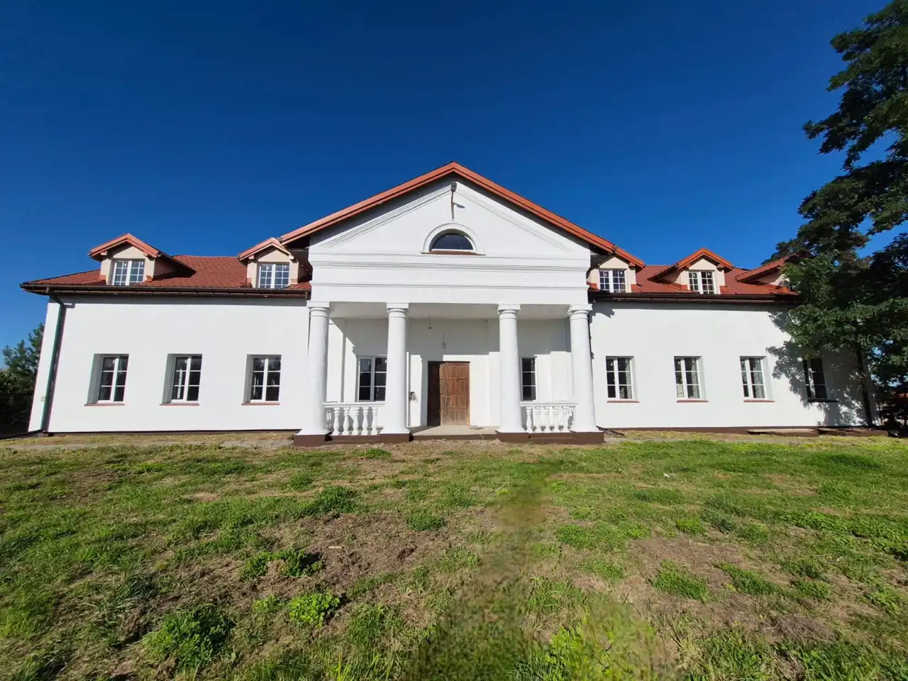 Frontowa elewacja imponuje trójkątnym frontonem, wspartym na czterech smukłych kolumnach w małym porządku, które nadają bryle dworku wyjątkowej lekkości i reprezentacyjnego charakteru. Całość dopełniają dwie stylowe lukarny, rozmieszczone symetrycznie po bokach frontonu, subtelnie doświetlające poddasze.