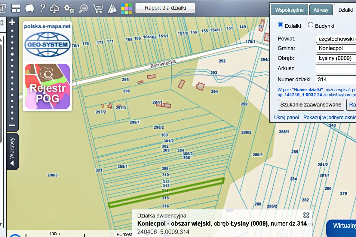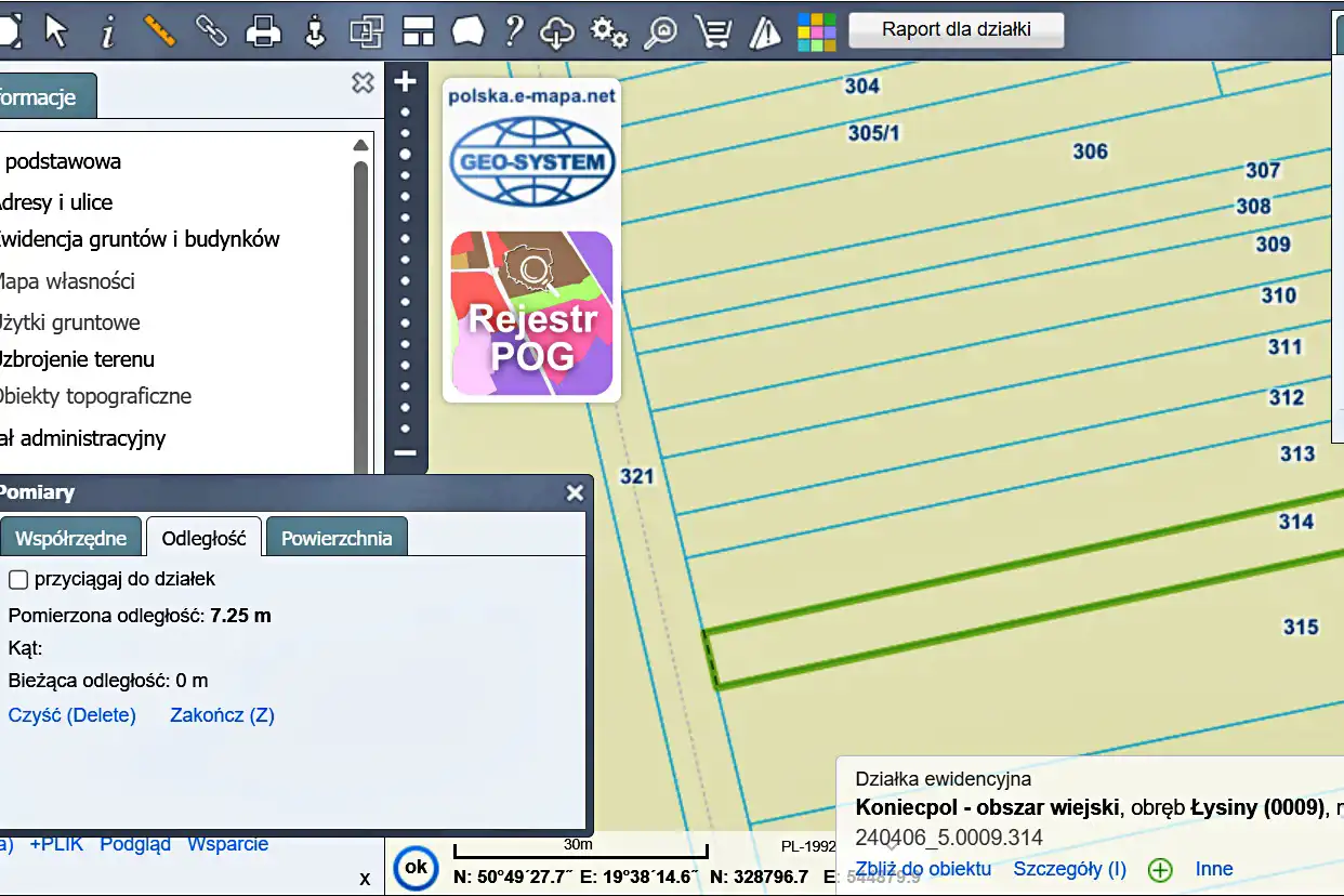 Grunt oznaczony w ewidencji nr 314 o powierzchni 1141 m2 i szerokości ok. 7 m.