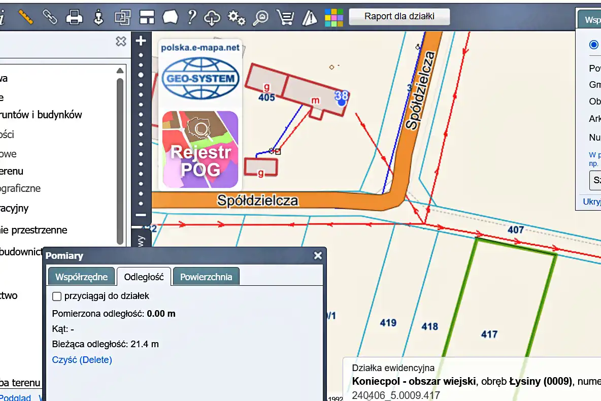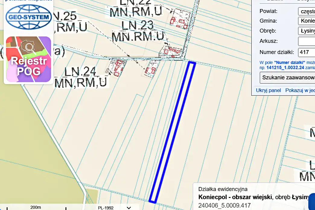 Grunt oznaczony w ewidencji nr 417 o powierzchni 1,0227 ha i szerokości ok. 20 m.