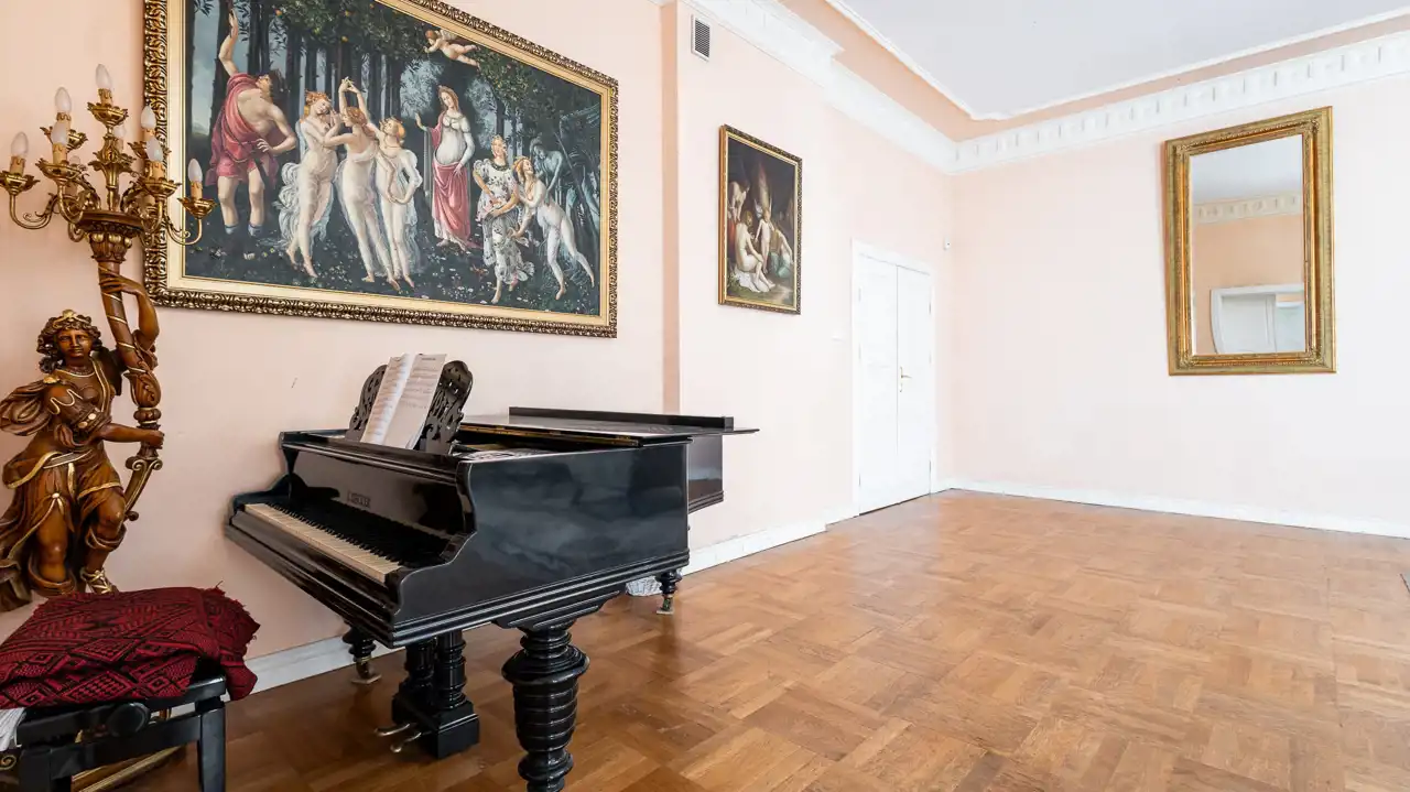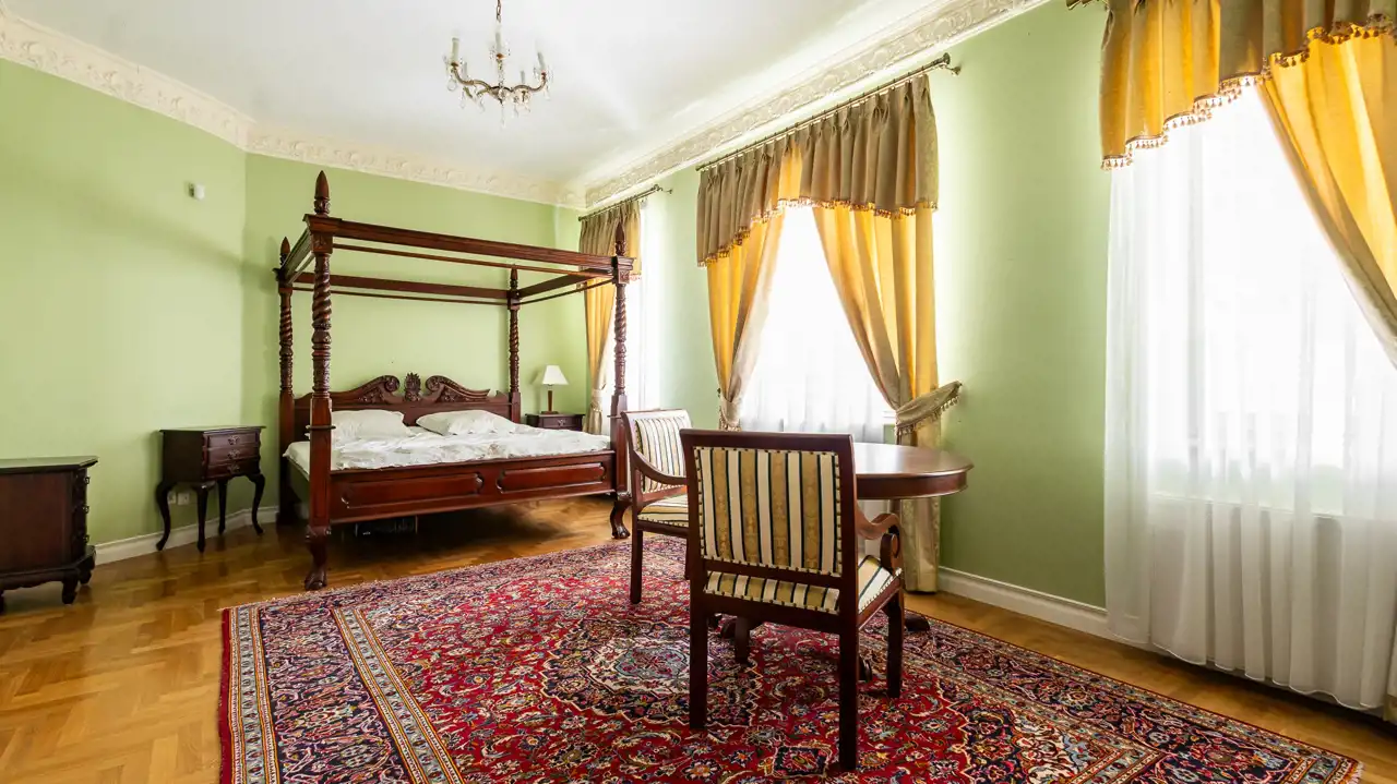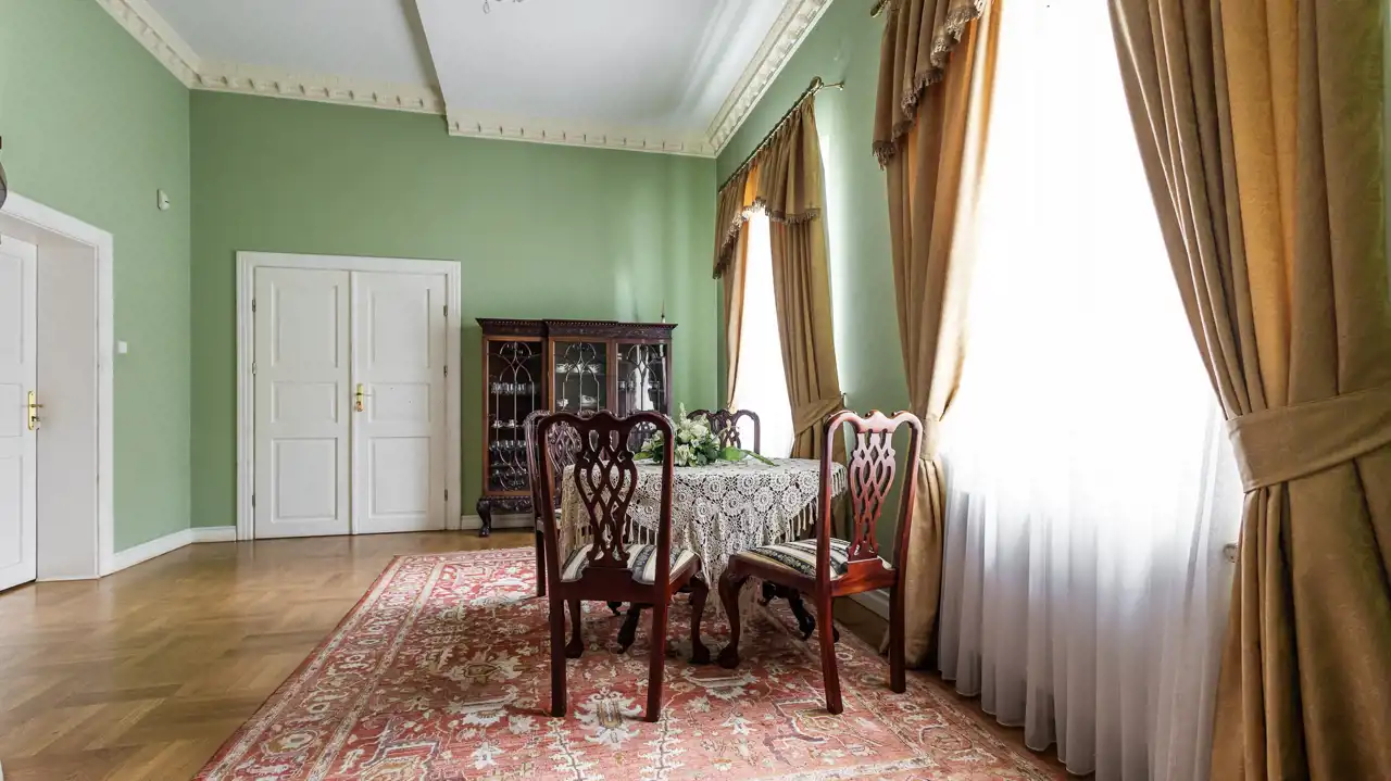 Historyczny charakter nieruchomości podkreśla jej barokowe umeblowanie oraz starannie dobrane wyposażenie, na które składają się obrazy, perskie dywany, kosztowna zastawa stołowa, a także piękny fortepian firmy Bekker z 1917 roku. Część widocznego na zdjęciach umeblowania i wyposażenia wliczona jest w cenę nieruchomości. Pozostałe elementy można odkupić od obecnych właścicieli – cena wymaga ustalenia.