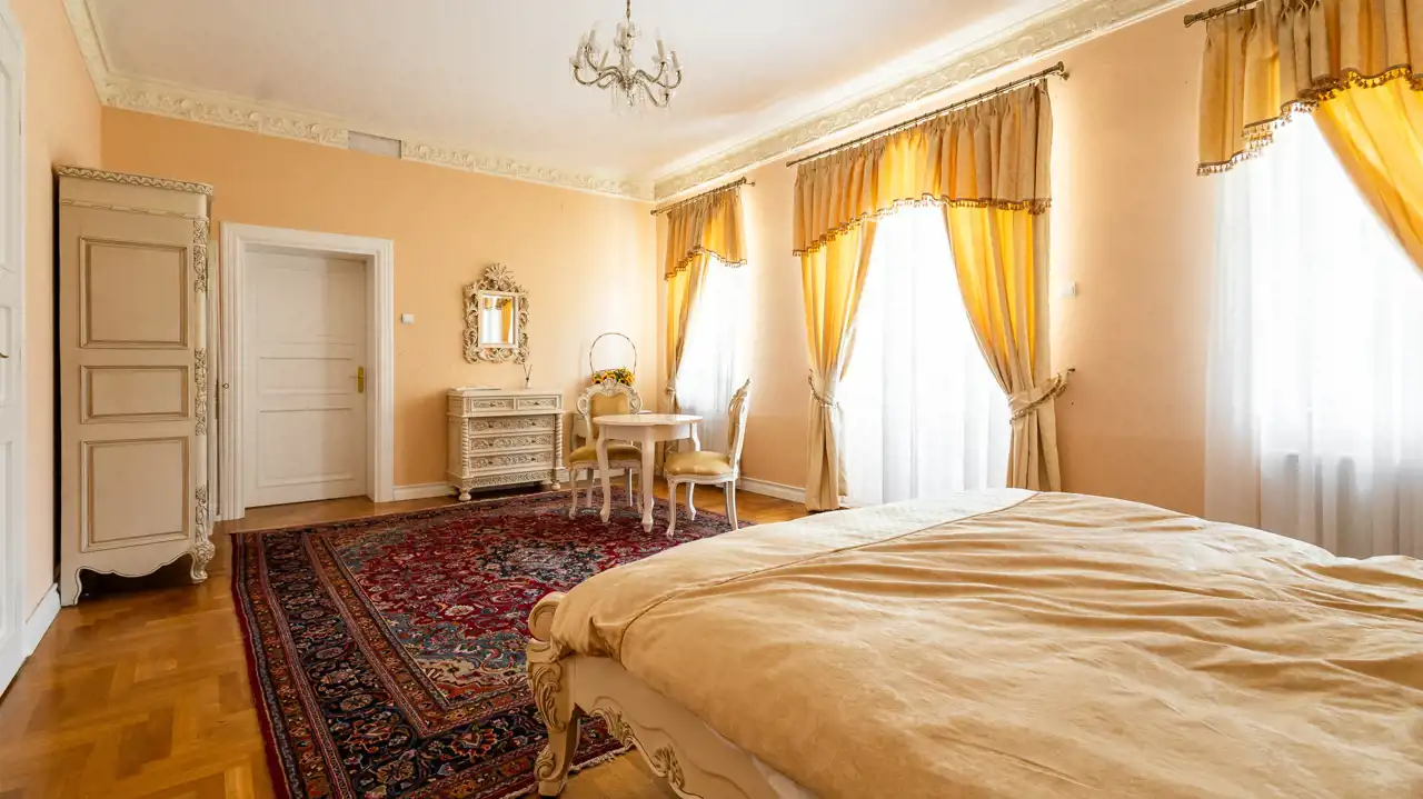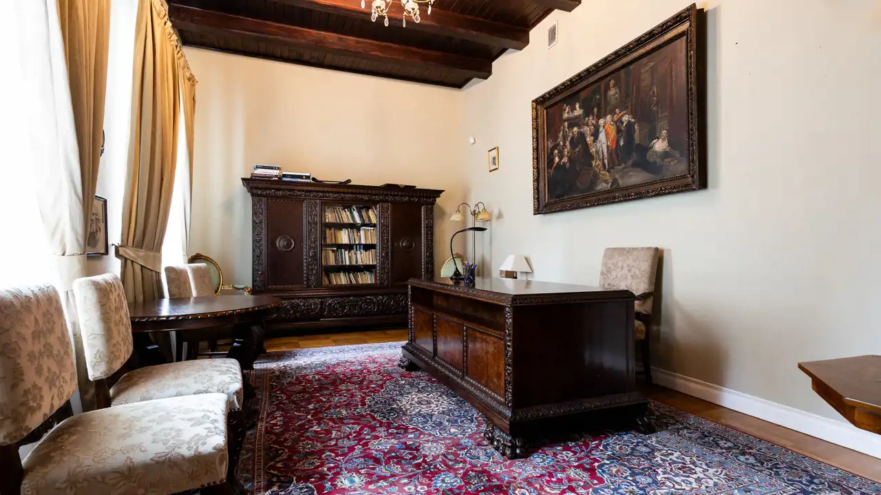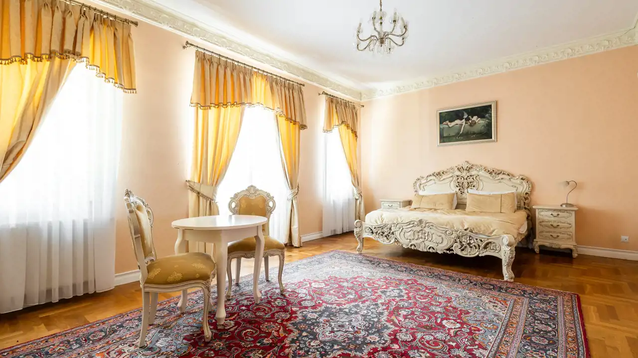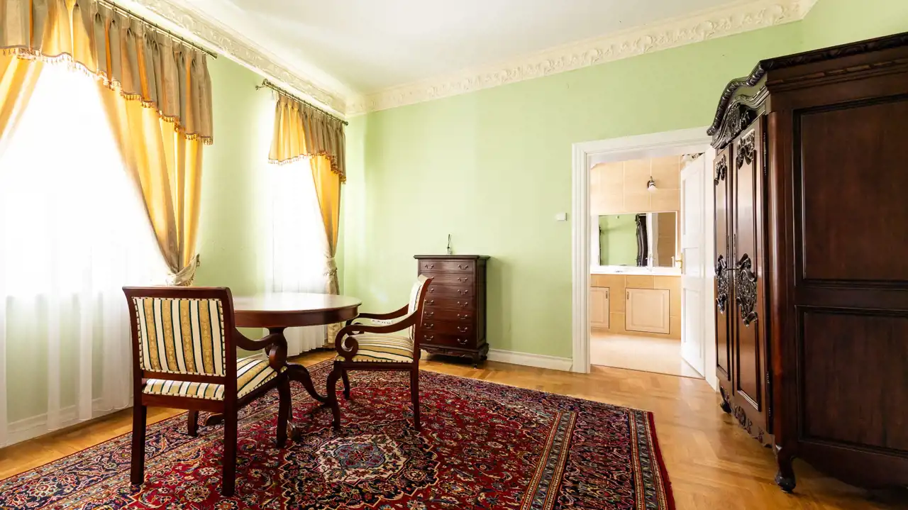 Historyczny charakter nieruchomości podkreśla jej barokowe umeblowanie oraz starannie dobrane wyposażenie, na które składają się obrazy, perskie dywany, kosztowna zastawa stołowa, a także piękny fortepian firmy Bekker z 1917 roku. Część widocznego na zdjęciach umeblowania i wyposażenia wliczona jest w cenę nieruchomości. Pozostałe elementy można odkupić od obecnych właścicieli – cena wymaga ustalenia.