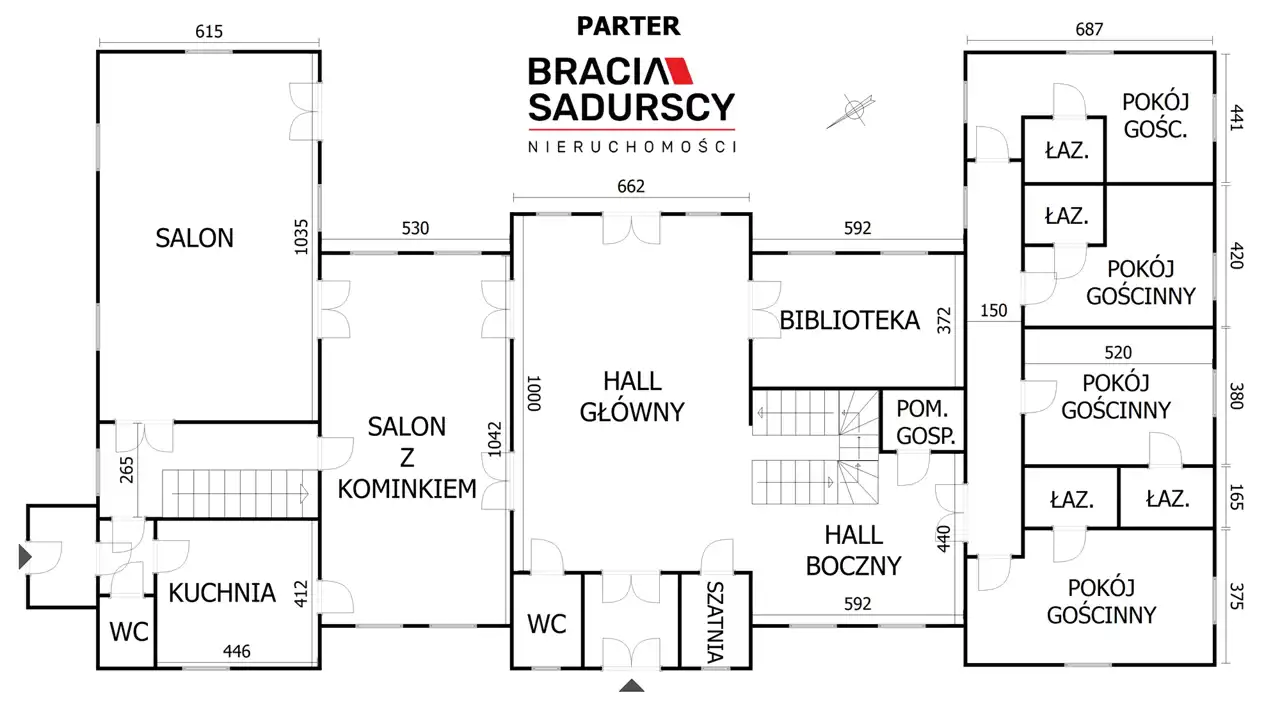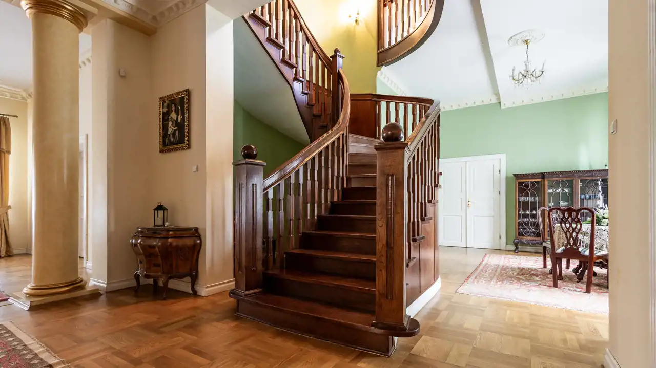 Parter wywiera imponujące wrażenie już od progu – tuż za drzwiami wejściowymi i wiatrołapem znajduje się efektowny hall o reprezentacyjnym charakterze, z którego można przejść na tyły Pałacu, udać się na górne kondygnacje lub do skrzydeł bocznych. Na górę wiodą drewniane, fantazyjnie kręcone schody, które zwieńczono obustronną balustradą z tego samego materiału. Do hallu głównego przylega stylowa biblioteka oraz sala kominkowa z jadalnią. W prawym skrzydle mieszczą się cztery komfortowe sypialnie z indywidualnymi łazienkami. W lewym znajduje się salon oraz duża kuchnia z niezależnym wyjściem bocznym.