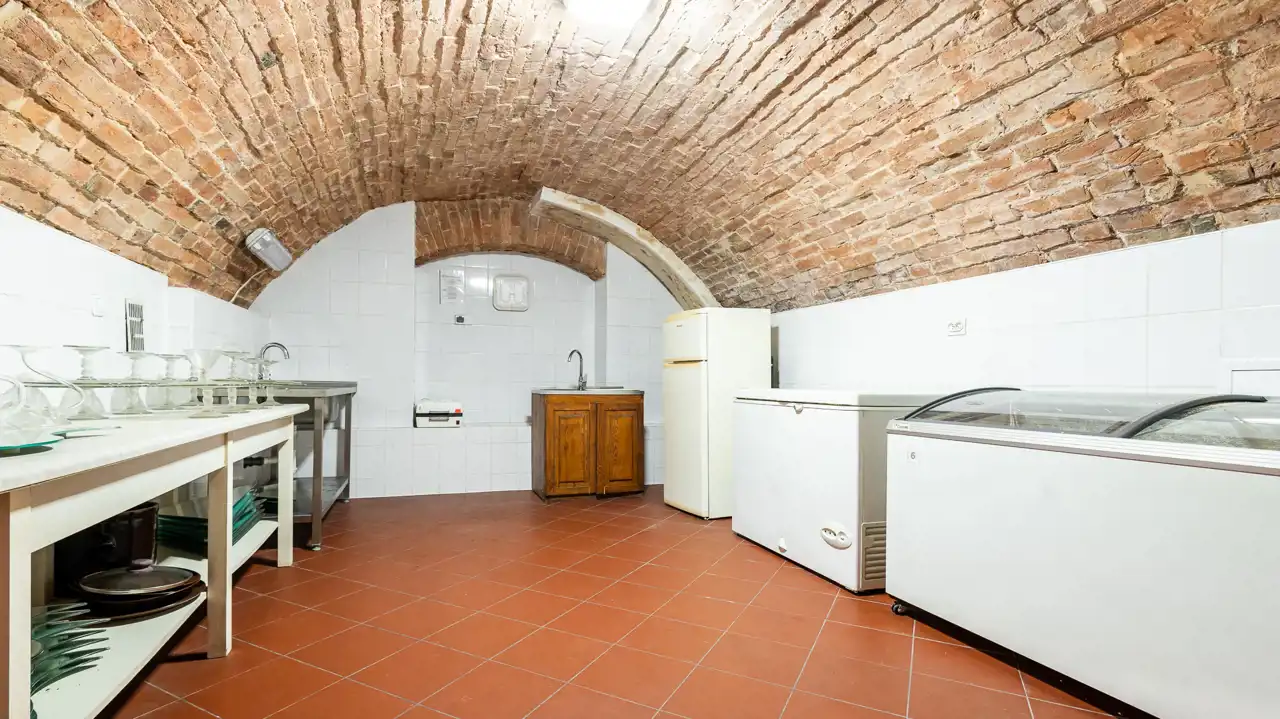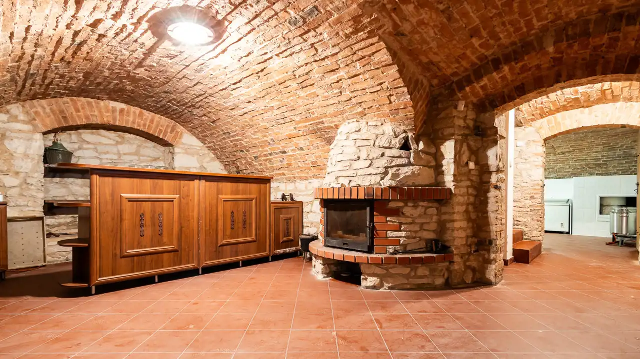 Podpiwniczenie Pałacu pochodzi z XVI wieku – to obszerna przestrzeń mogąca służyć do przygotowywania i magazynowania żywności, napojów lub do przechowywania trunków. W piwnicy tej panuje bowiem sprzyjający mikroklimat i optymalne temperatury bez względu na porę roku. Łukowate sklepienia ceglane oraz ściany z cegły i kamienia pozwalają poczuć historyczny charakter tego miejsca. Współczesne posadzki w ceglastym kolorze są za to łatwe do utrzymania w czystości. Na tym poziomie znajduje się również murowany kominek. Dostęp do tych części piwnicy możliwy jest wyłącznie schodami znajdującymi się w lewym skrzydle budynku.