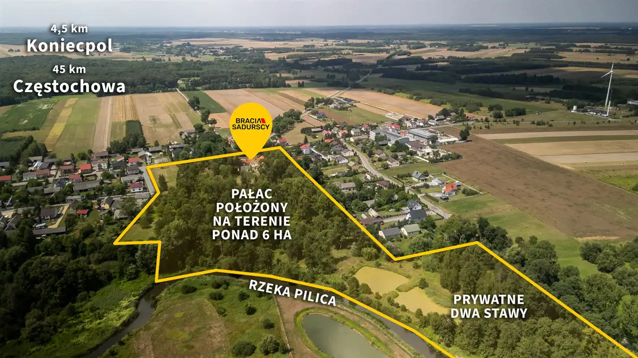 - Pałac znajduje się w odległości zaledwie 4,5 kilometra od centrum Koniecpola, 28 kilometrów od Złotego Potoku z zabytkowym Pałacem Raczyńskich, 36 kilometrów od Pustyni Siedleckiej i 45 kilometrów od Częstochowy, co czyni go świetnym punktem startowym wielu wycieczek o różnorodnym charakterze.