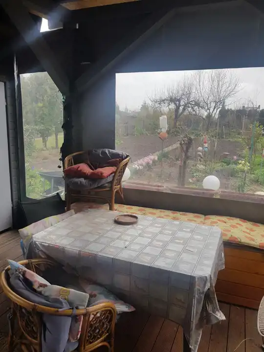 - W pełni wyposażony domek drewniany: Gotowy do użytku, z dużym zadaszonym tarasem, idealnym na letnie wieczory