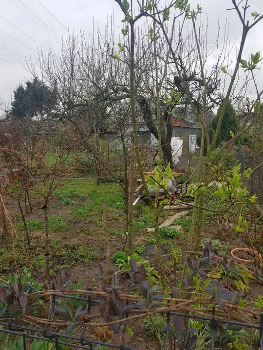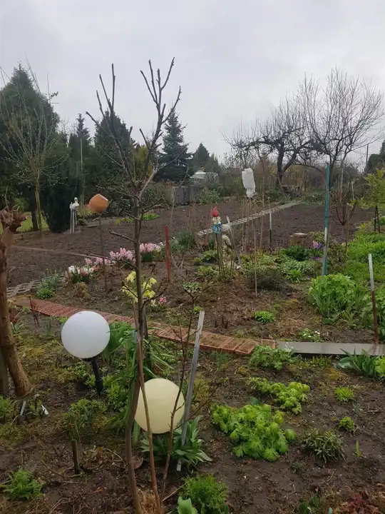 - Dużo nasadzeń: krzewy, kwiaty, drzewa owocowe