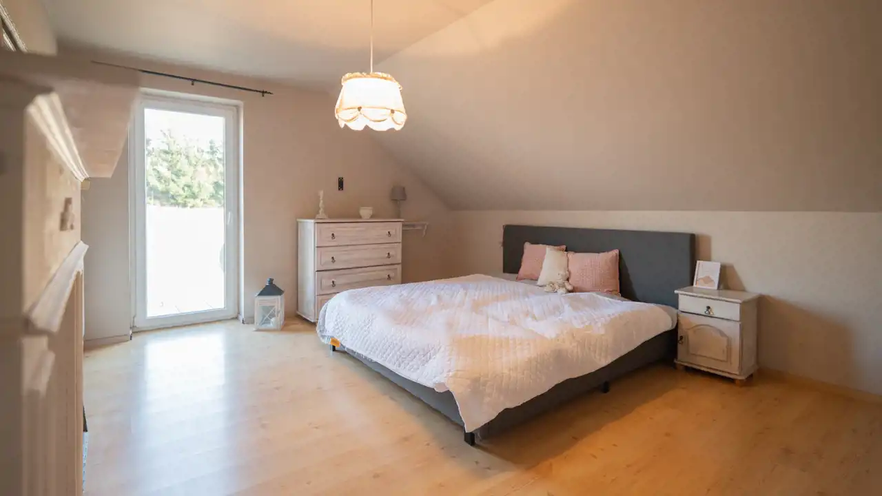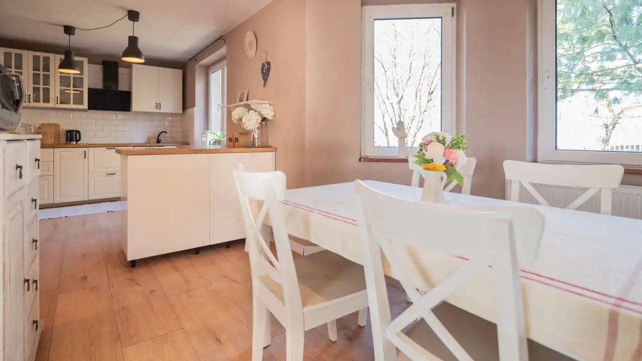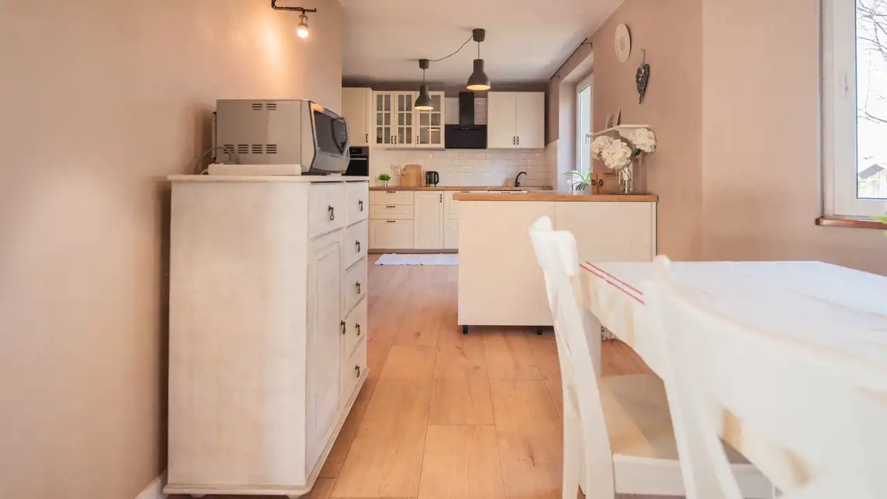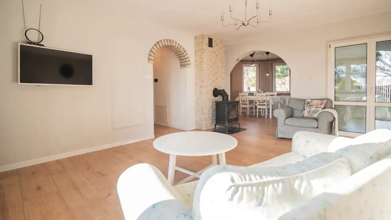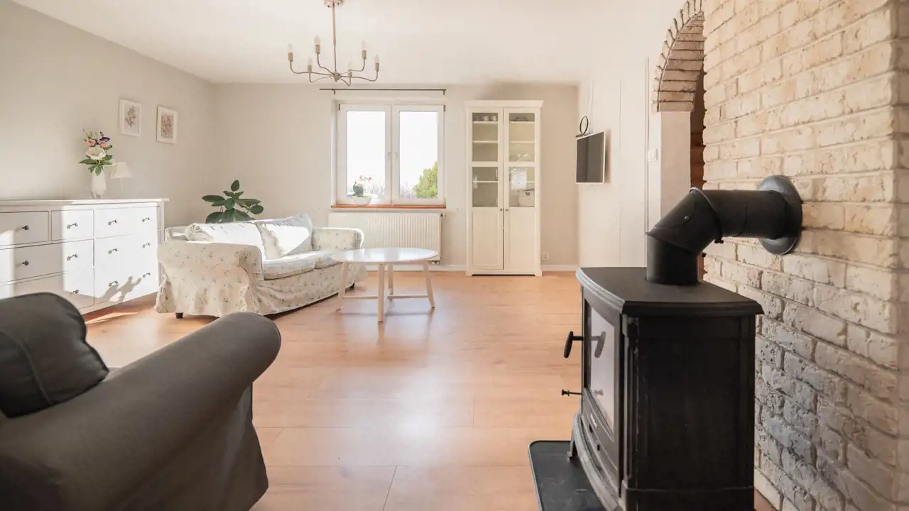 Dom jest funkcjonalny i przytulny, z dużą ilością naturalnego światła. Klimatyczny kominek w salonie zapewnia ciepłą atmosferę w chłodniejsze dni.