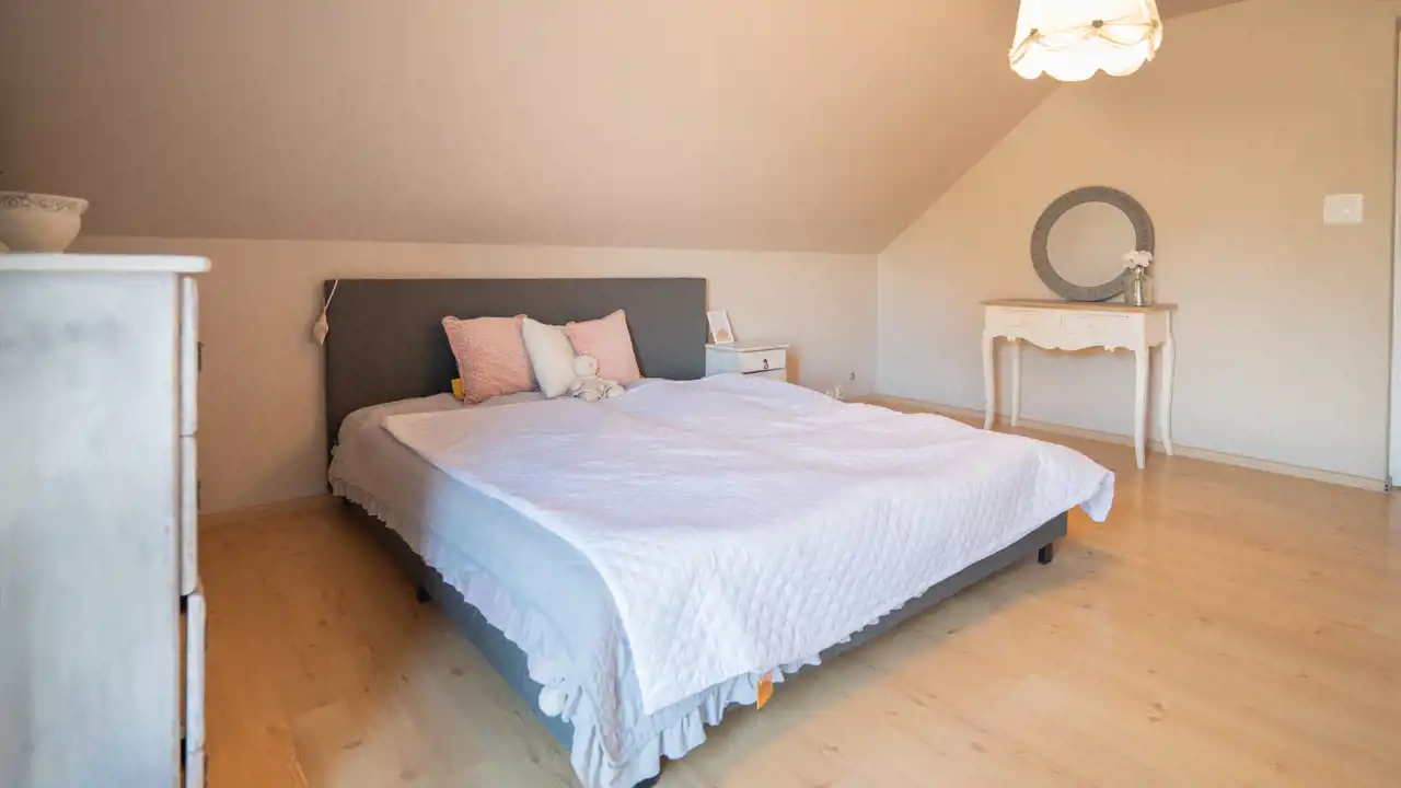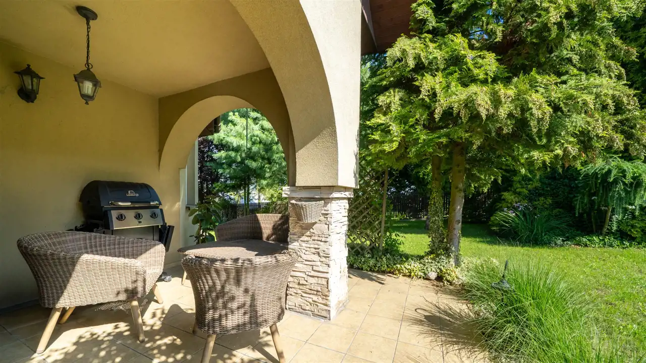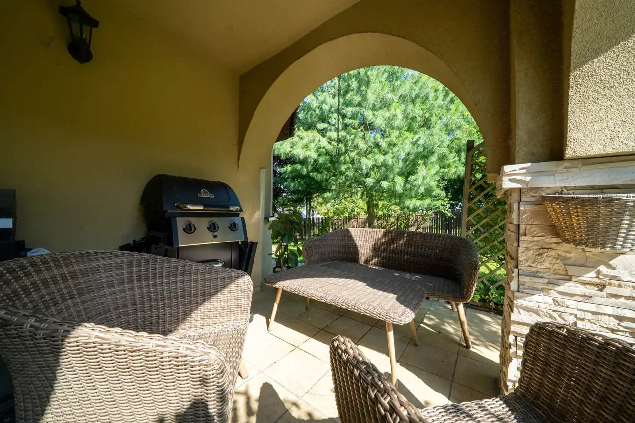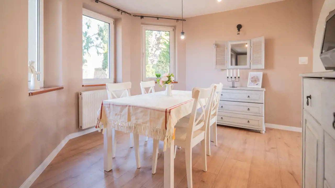 Dom jest funkcjonalny i przytulny, z dużą ilością naturalnego światła. Klimatyczny kominek w salonie zapewnia ciepłą atmosferę w chłodniejsze dni.