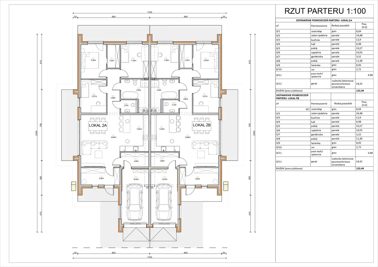 Powierzchnia 122,49 m2, na którą składa się: salon z jadalnią (ok. 25 m2), kuchnia, 2 pokoje, sypialnia, garderoba, łazienka, wc, pom. techniczne / spiżarnia, wiatrołap, hall, garaż jednostanowiskowy 18,32 m2