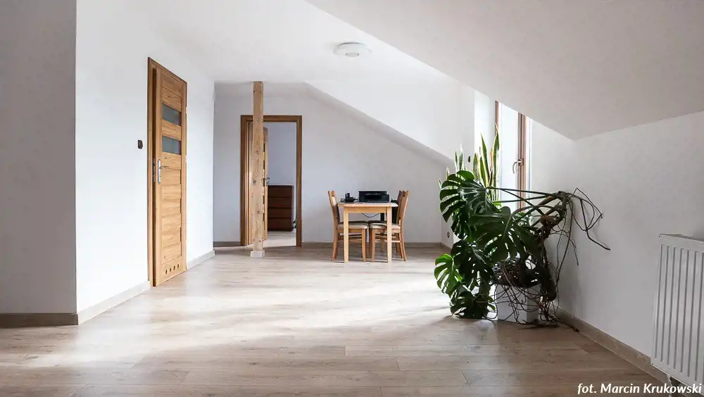 Na powierzchnię mieszkalną ok. 190 m2 składa się parter (salon z jadalnią i kuchnią - ok. 39 m2, sypialnia - 21,50 m2, sypialnia - 17 m2, łazienka z wc, wc, garderoba, wiatrołap) oraz poddasze użytkowe (salon - 30 m2, sypialnia z garderobą - 21 m2 + 9,36 m2, pokój - 13,80 m2, pokój / kuchnia (doprowadzone przyłącza) - 22 m2, łazienka z WC - 5 m2).