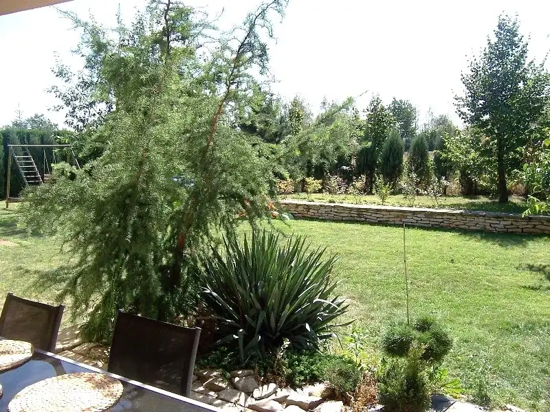 Działka ogrodzona (frontowe kute i siatka), z licznymi nasadzeniami i zadbanym ogrodem.