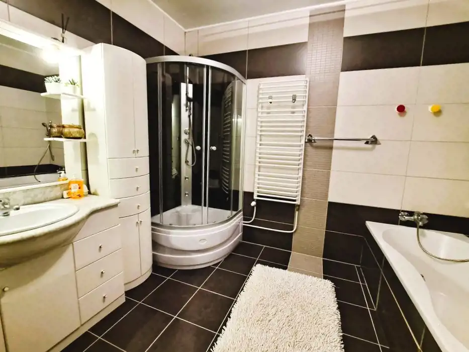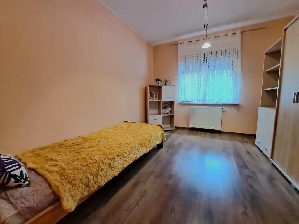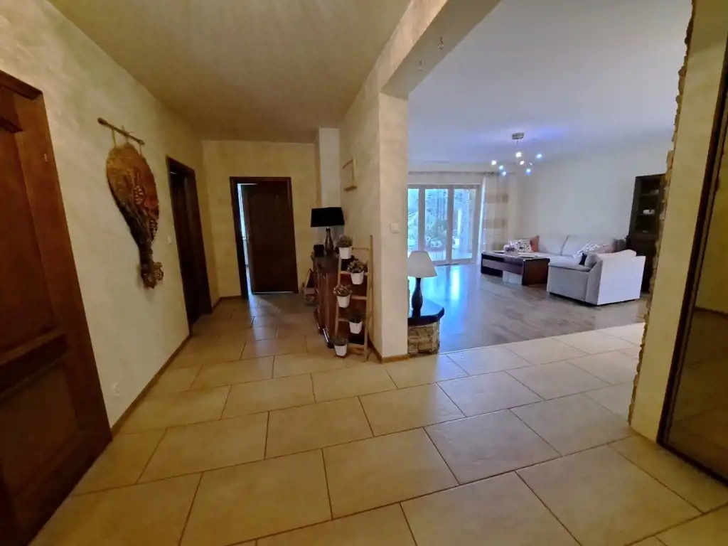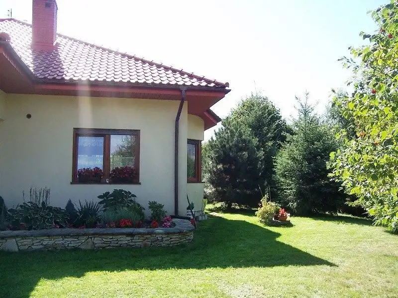 Ściany pokryte gładzią gipsową i glazurą, podłogi wykończone panelami oraz terakotą. Okna PCV z parapetami z konglomeratu zapewniają bardzo dobrą izolację, a drewniane, antywłamaniowe drzwi zewnętrzne podkreślają solidny charakter budynku.