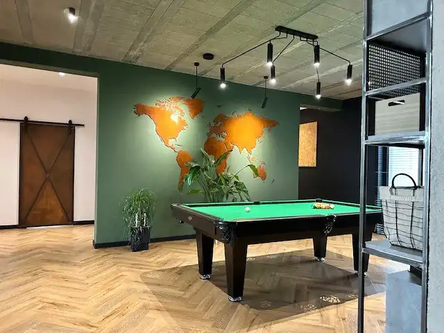 Loftowy charakter duże przeszklenia, surowy beton, czerwona cegła, metalowe elementy dekoracji i umeblowania, widoczne instalacje tworzą wnętrze w którym codzienność ma wyjątkowy rytm.