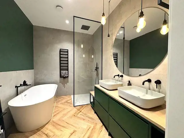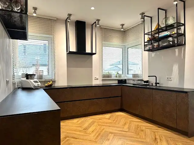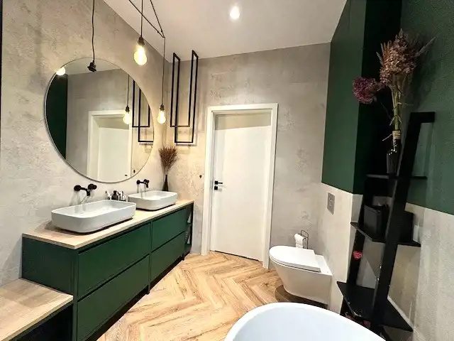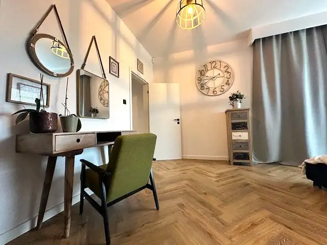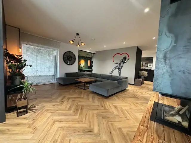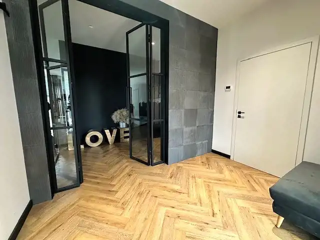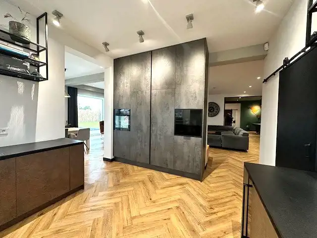 - winylowa podłoga imitująca drewno ułożona w jodełkę i zabudowa stolarska wykonana na zamówienie