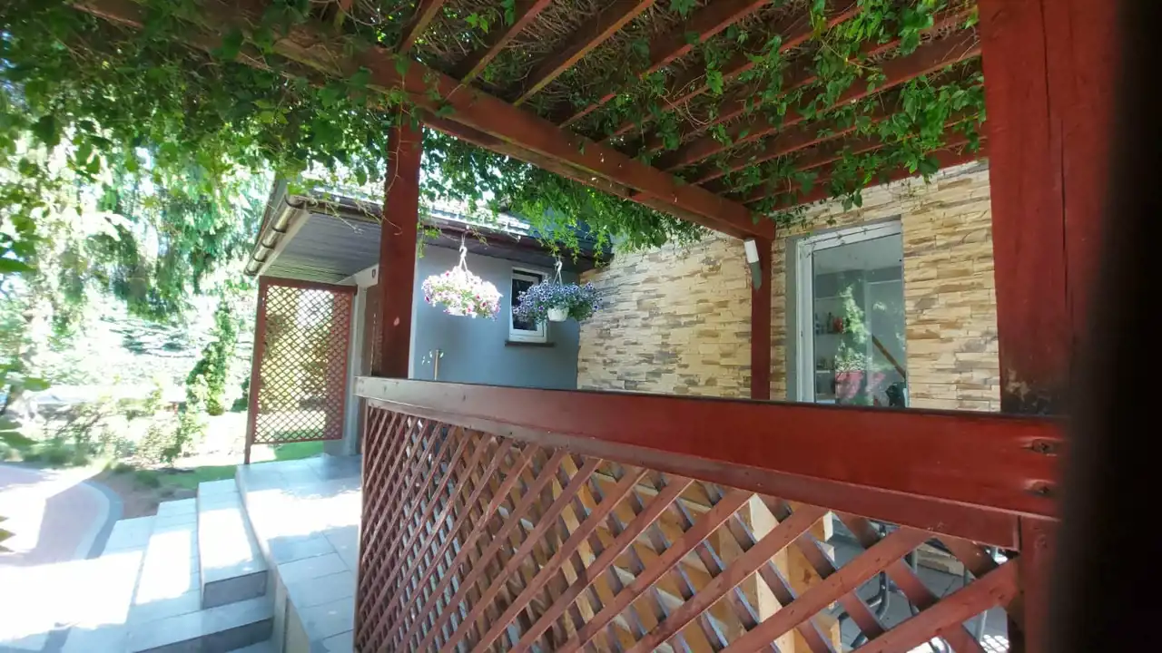 Działka całkowicie ogrodzona z otwieraną bramą wjazdową. Od strony drogi znajdują się nasadzenia ozdobne w postaci krzewów i traw, natomiast za domem oraz obok krzewy i drzewa owocowe. Na parterze dostępne ogrzewanie podłogowe. Woda dociągnięta jest ze studni głębinowej, jednocześnie na działce znajduje się przyłącze do wodociągu.
