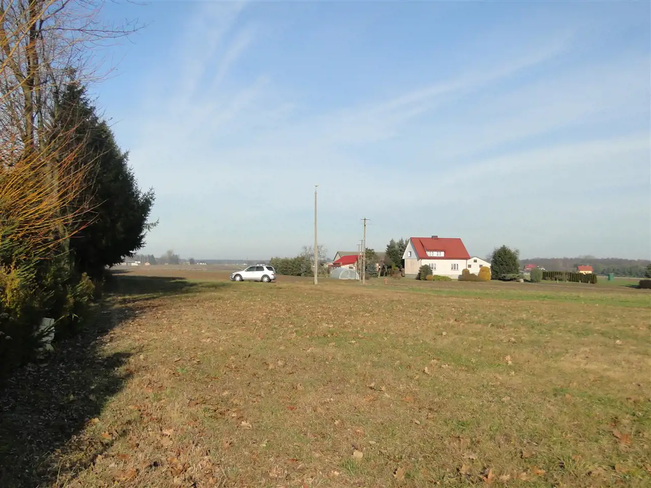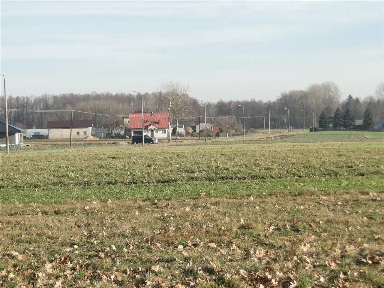 Działka zlokalizowana bezpośrednio przy drodze asfaltowej oświetlonej latarniami.