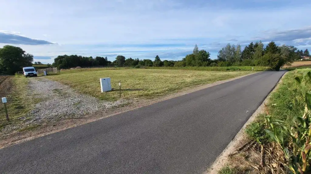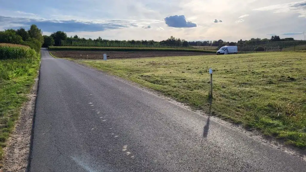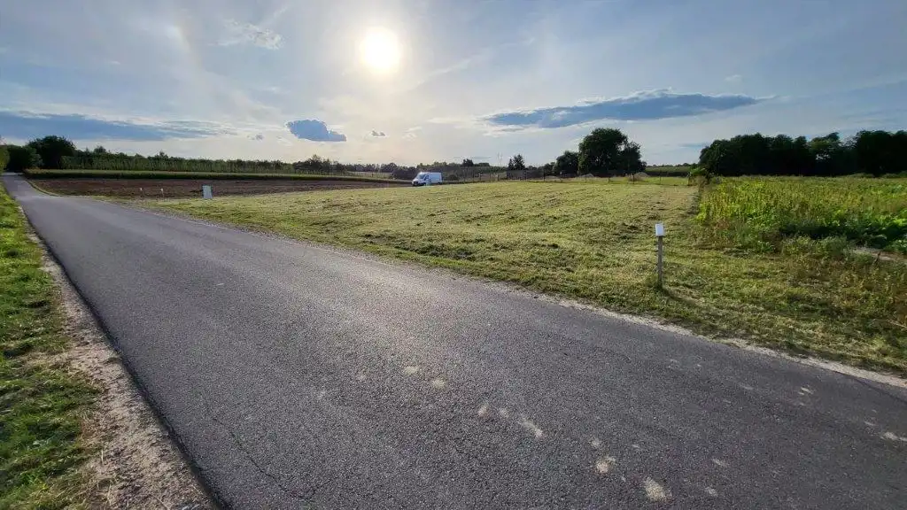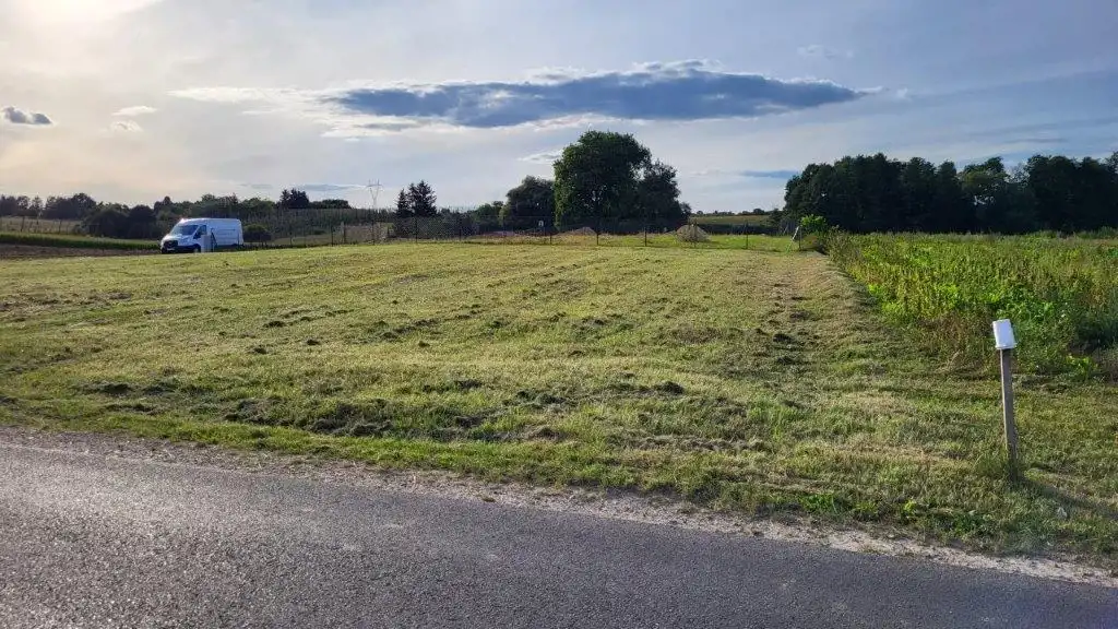 Działka jest płaska, ale leży w pięknej, lekko pofalowanej okolicy ze sporą ilością drzew.