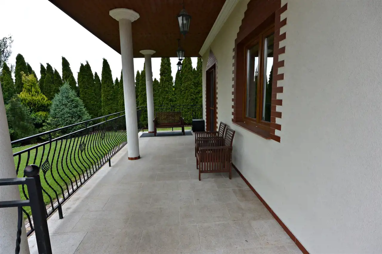 Salon dobrze doświetlony z ekspozycją południową. Z salonu i dwóch sypialni wyjście na duży taras o powierzchni ok. 60 m2, z granitową posadzką. W salonie możliwość instalacji kominka. Posesja zadbana, z 15-letnim ogrodem z licznymi nasadzeniami ozdobnymi oraz dębową altaną.