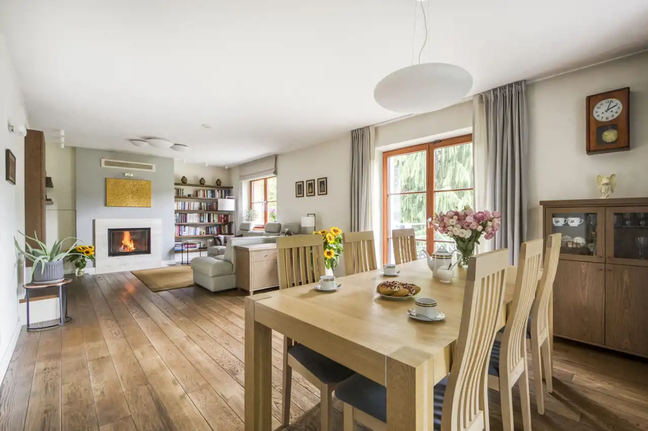 Unikatowe, praktyczne rozplanowanie domu z wygodną strefą dzienną, funkcjonalnymi sypialniami, strefą relaksu: sauną i salą fitness zostały zaplanowane w jednej z bardziej znanych pracowni architektonicznych. Liczne udogodnienia - pralnia z suszarnią, kominek, odkurzacz centralny, wygodne zejście do ogrodu sprawiają, że mieszkanie w nim to duża przyjemność. Wysoki standard wykończenia, nie tylko materiałami dobrej jakości, ale przyjaznymi dla środowiska i zdrowia rodziny stwarza wyjątkowy klimat. Właściciele zadbali również o organizację ujęcia wody głębinowej.