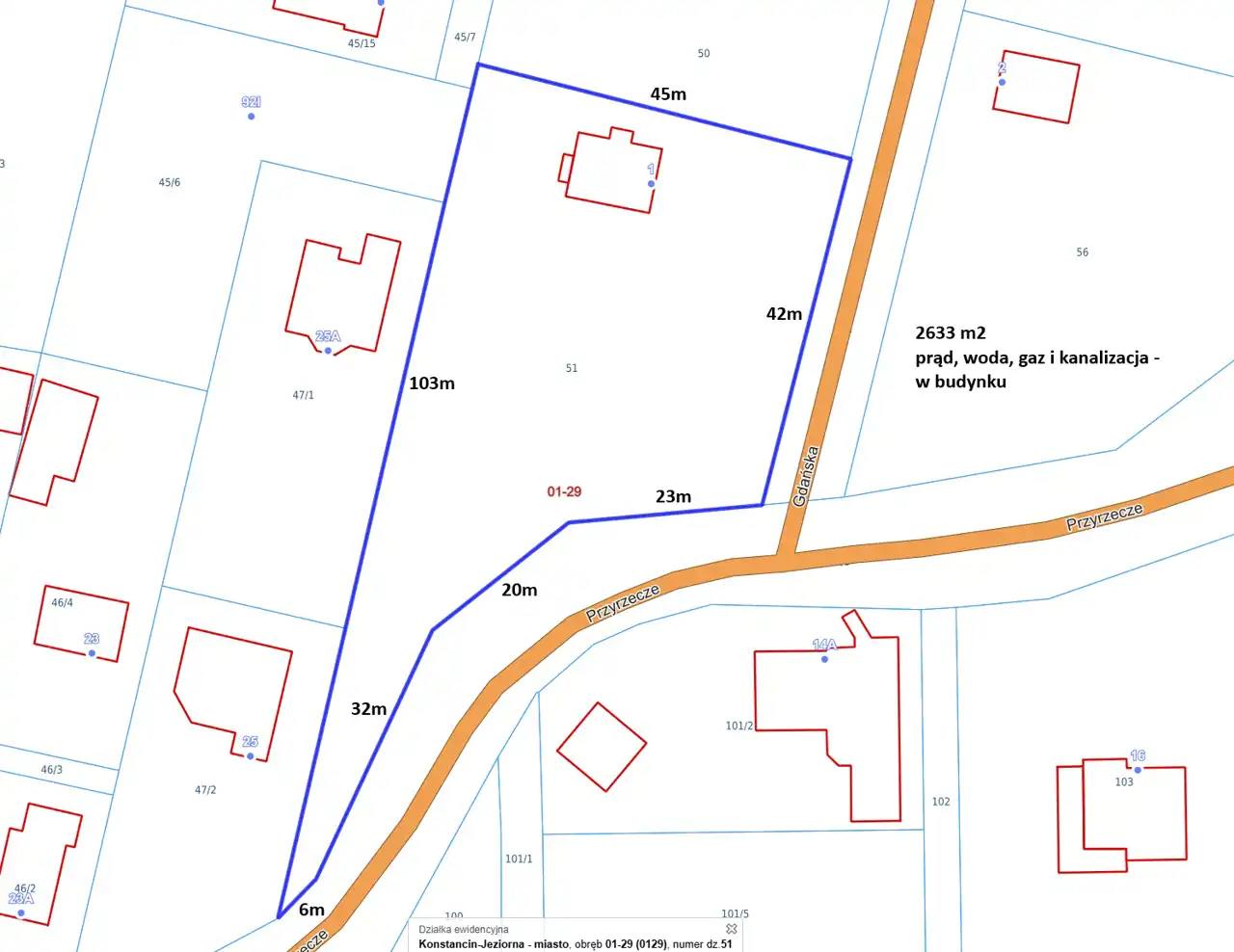 - Media Woda: na działce; Kanalizacja: na działce; Prąd: na działce; Gaz: na działce
