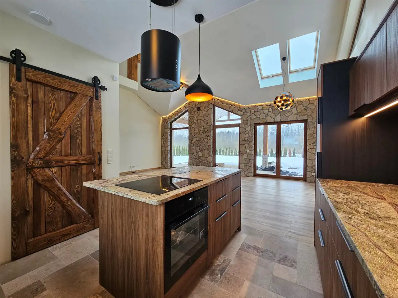 Brand new house, currently being finished. High-ceilinged living room with a large window overlooking the well-kept garden.