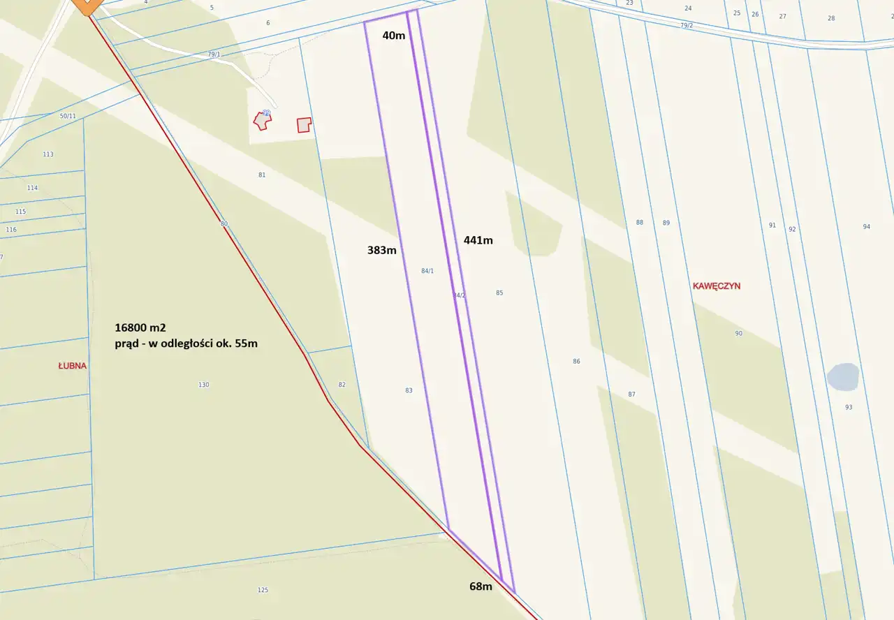 - Media Woda: brak; Kanalizacja: brak; Prąd: w ulicy; Gaz: brak