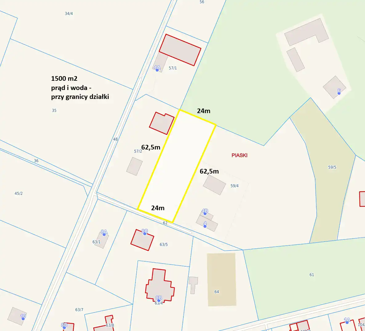 - Media Woda: w ulicy; Kanalizacja: brak; Prąd: w ulicy; Gaz: brak