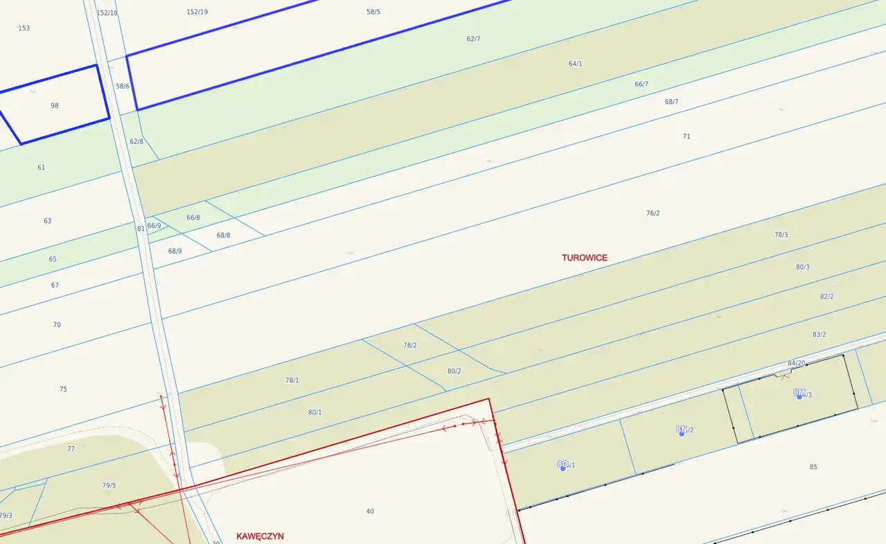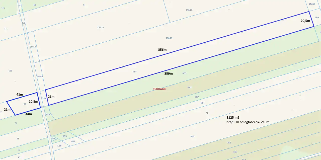 - Media Woda: brak; Kanalizacja: brak; Prąd: w ulicy; Gaz: brak
