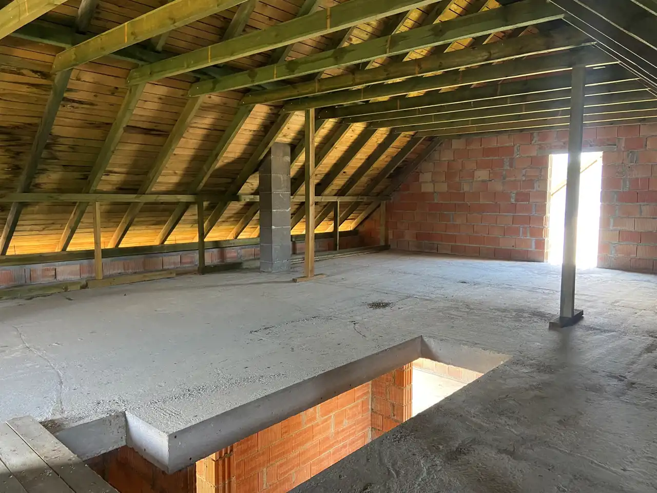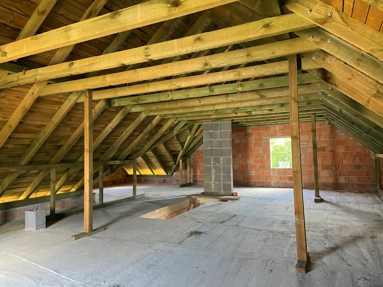 - Dach: drewniana więźba dachowa, papa, kąt nachylenia 30°, powierzchnia dachu 247 m²