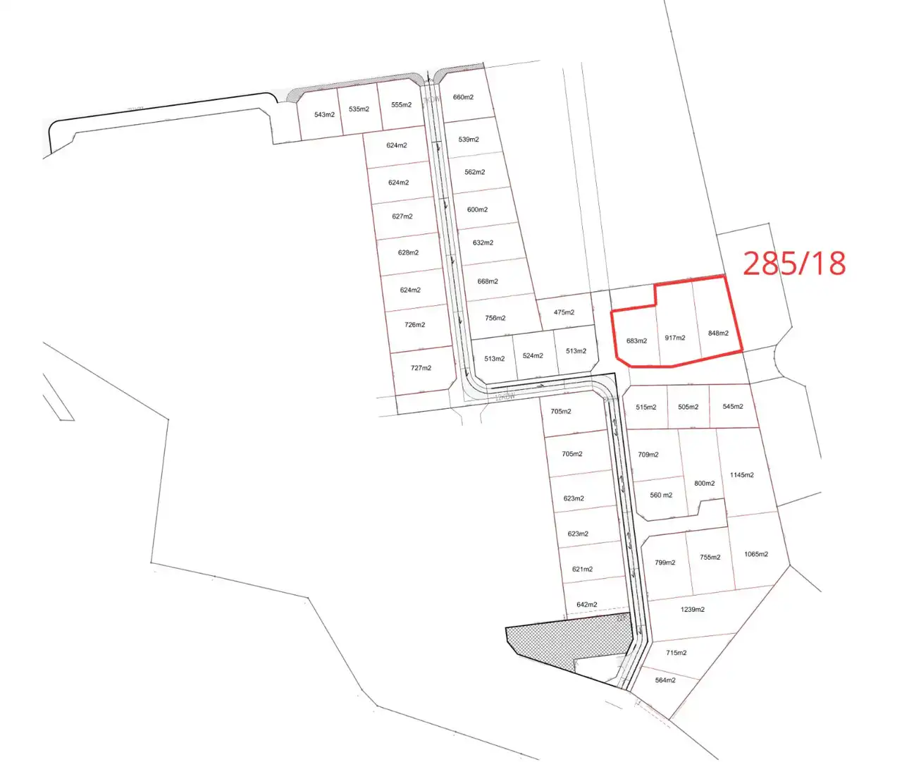 Proponowany podział terenu na mniejsze działki, zakładający maksymalizację możliwości zabudowy znajduje się w galerii ze zdjęciami.