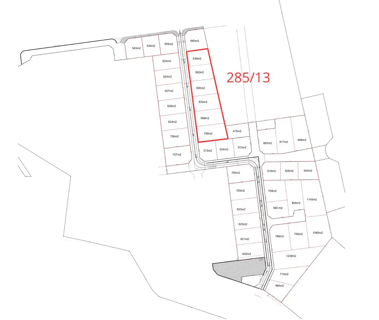 Proponowany podział terenu na mniejsze działki, zakładający maksymalizację możliwości zabudowy znajduje się w galerii ze zdjęciami.