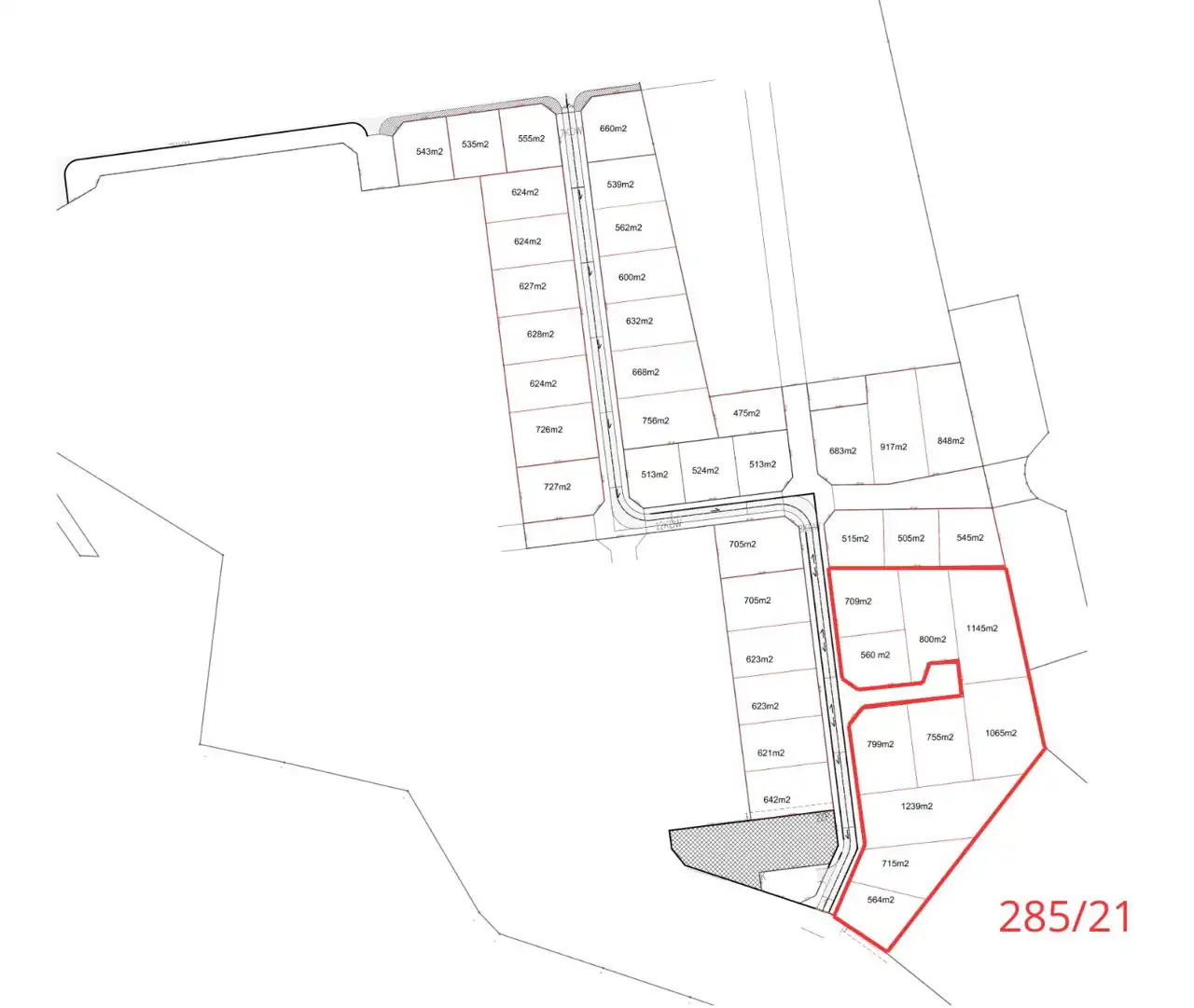 Proponowany podział terenu na mniejsze działki, zakładający maksymalizację możliwości zabudowy znajduje się w galerii ze zdjęciami.