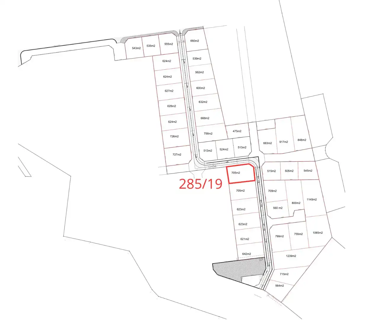 Proponowany podział terenu na mniejsze działki, zakładający maksymalizację możliwości zabudowy znajduje się w galerii ze zdjęciami.