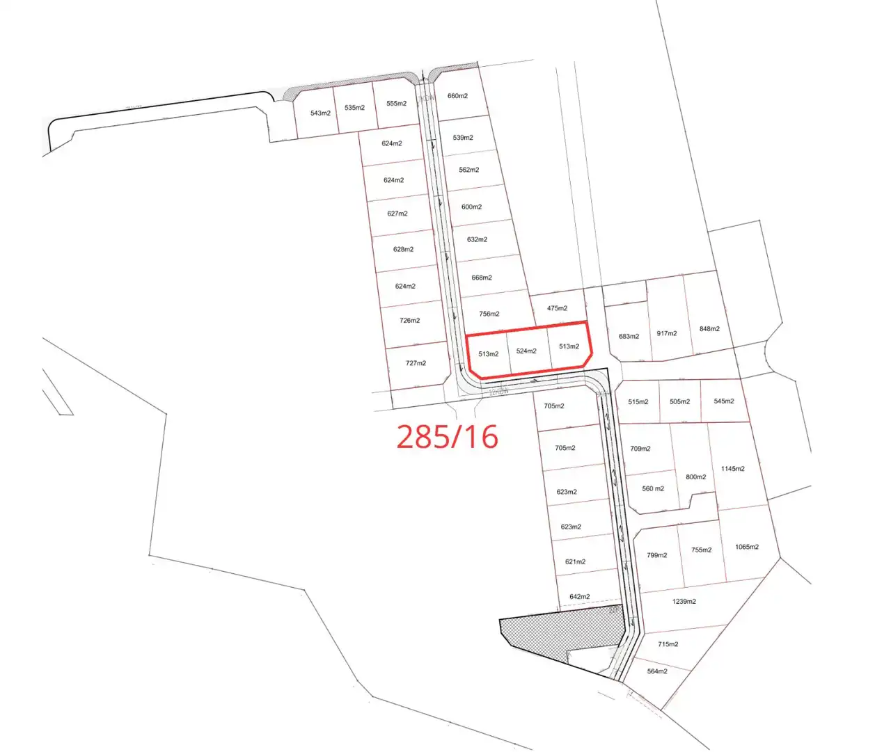 Proponowany podział terenu na mniejsze działki, zakładający maksymalizację możliwości zabudowy znajduje się w galerii ze zdjęciami.