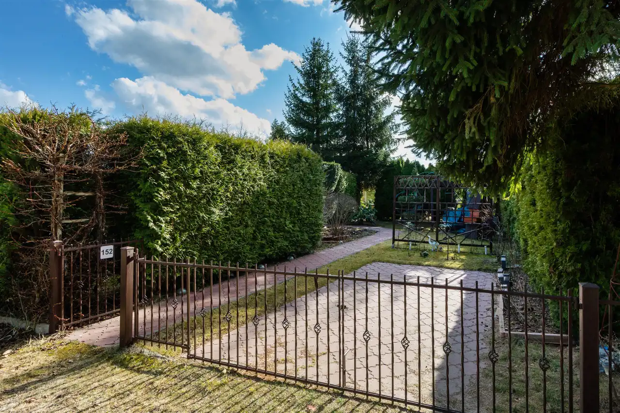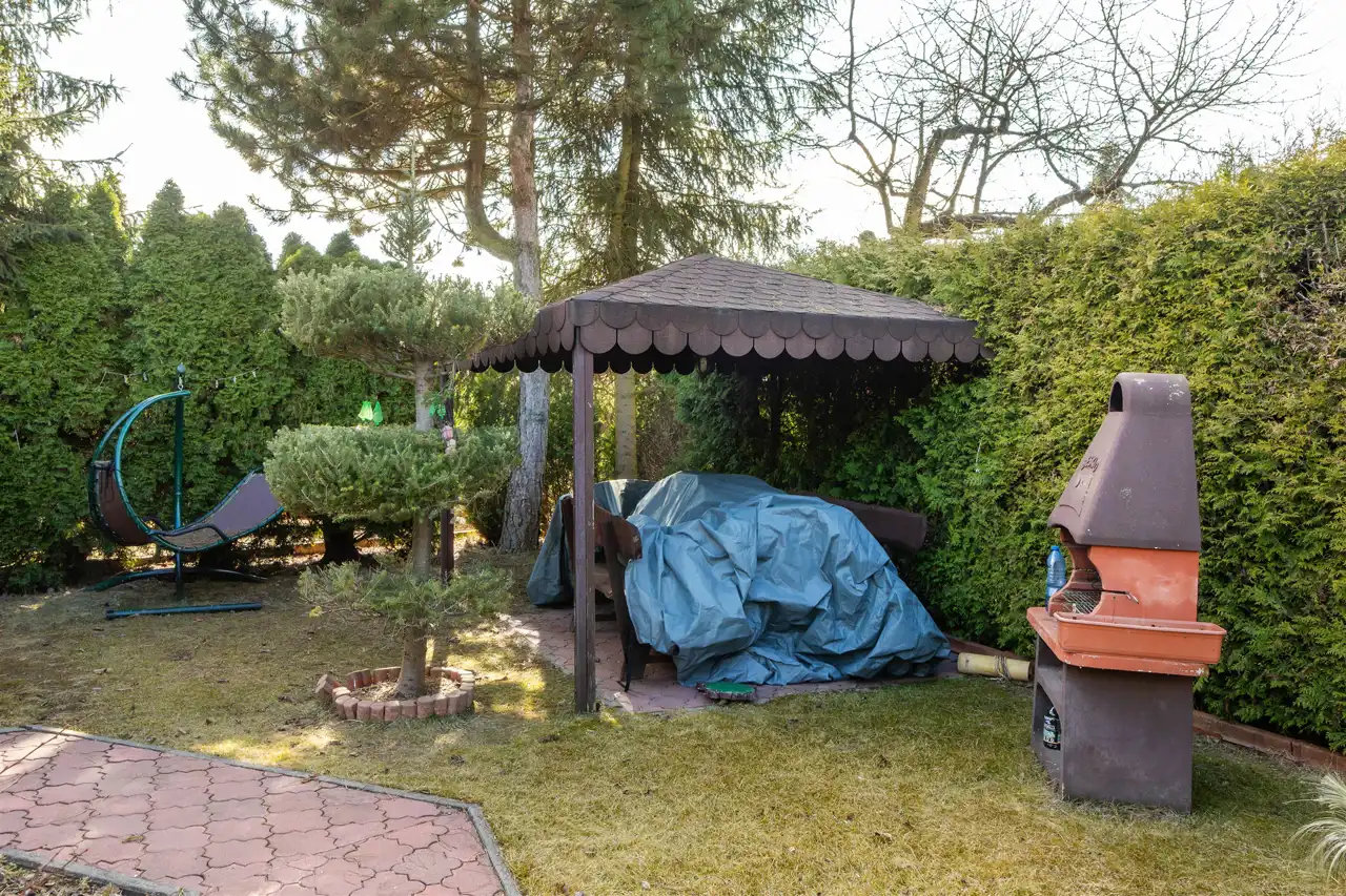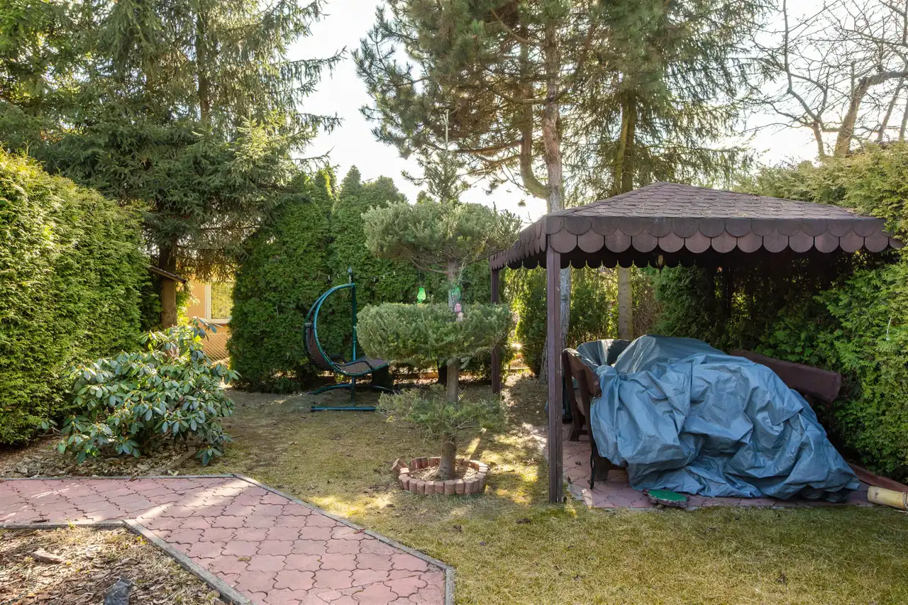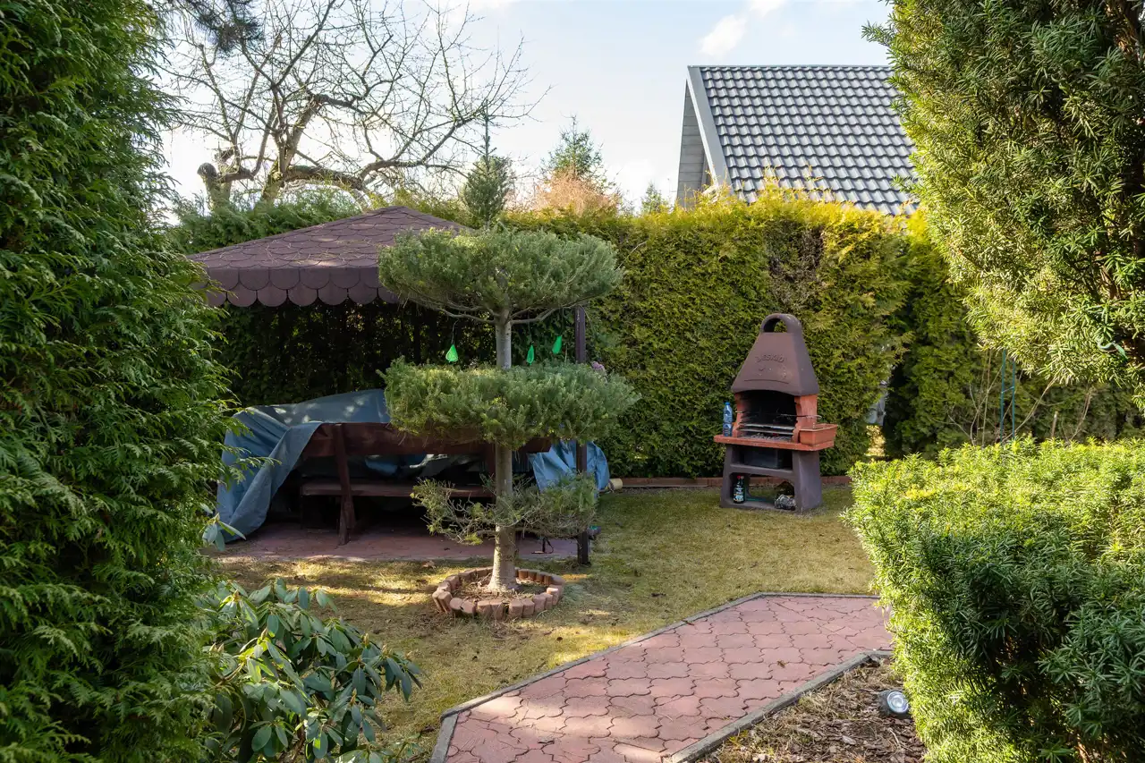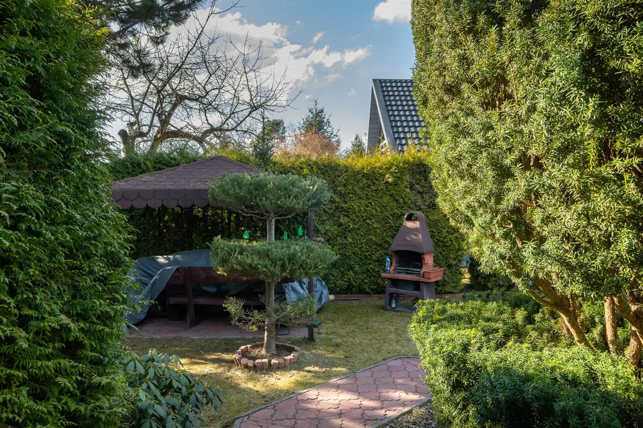 Działka jest ładnie zagospodarowana, z licznymi wieloletnimi drzewami i krzewami.