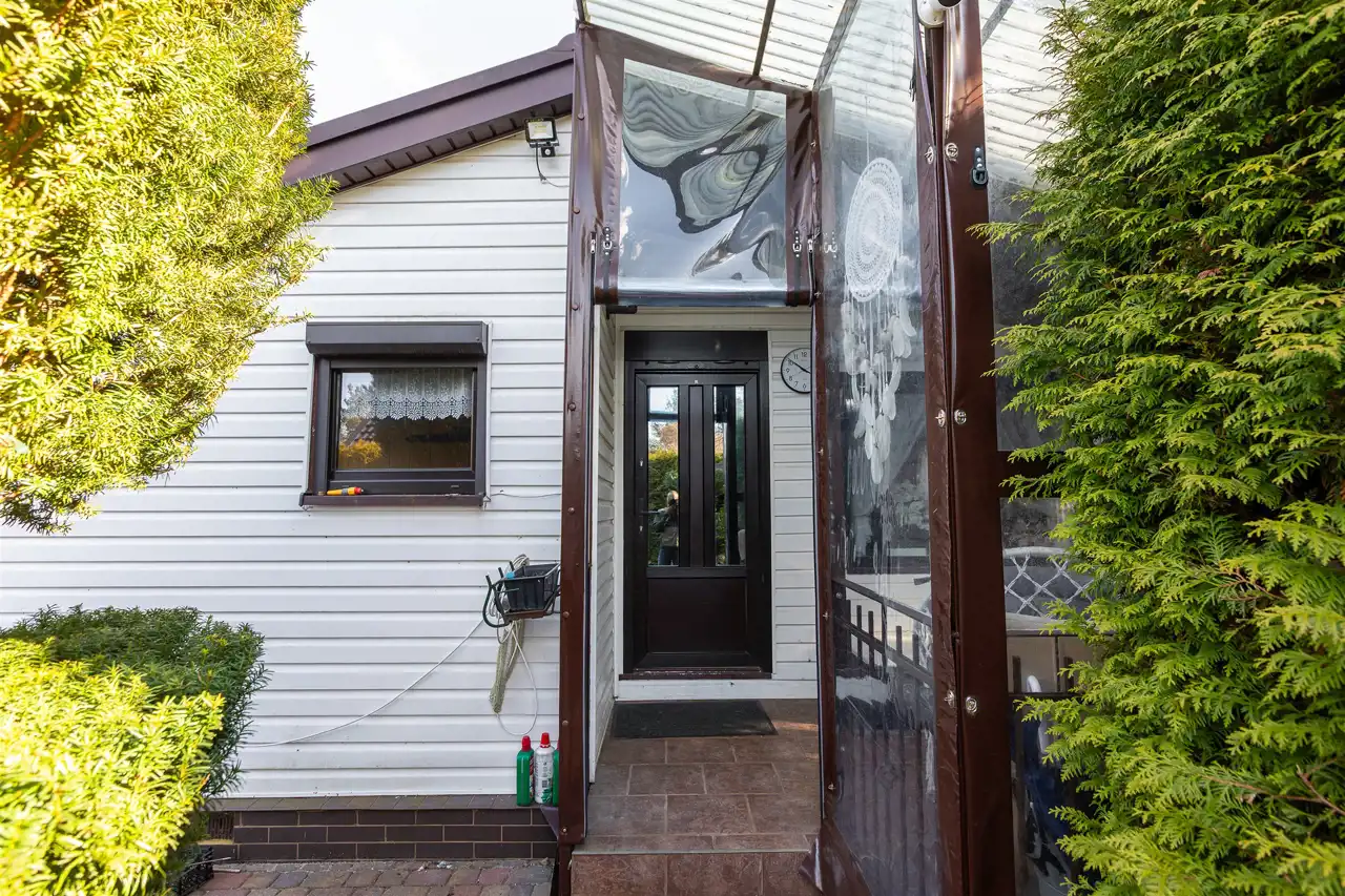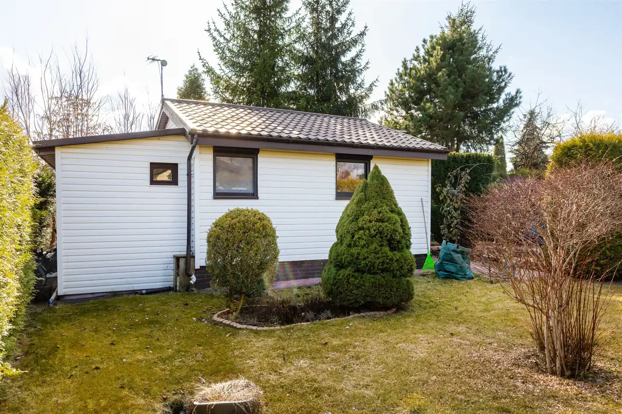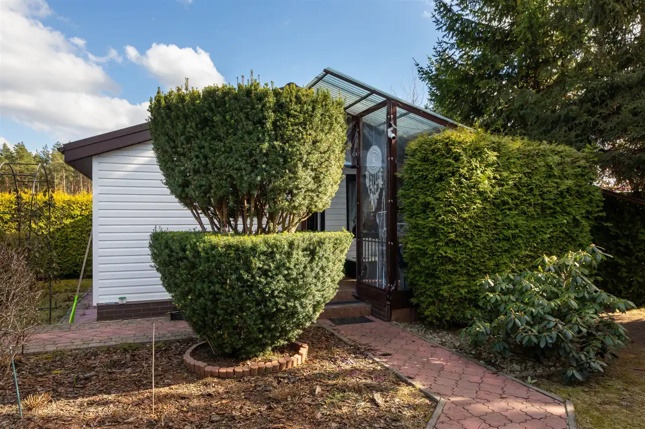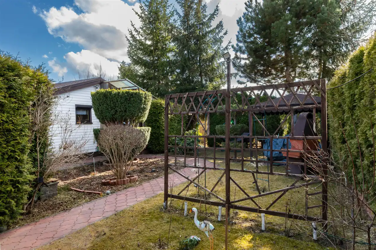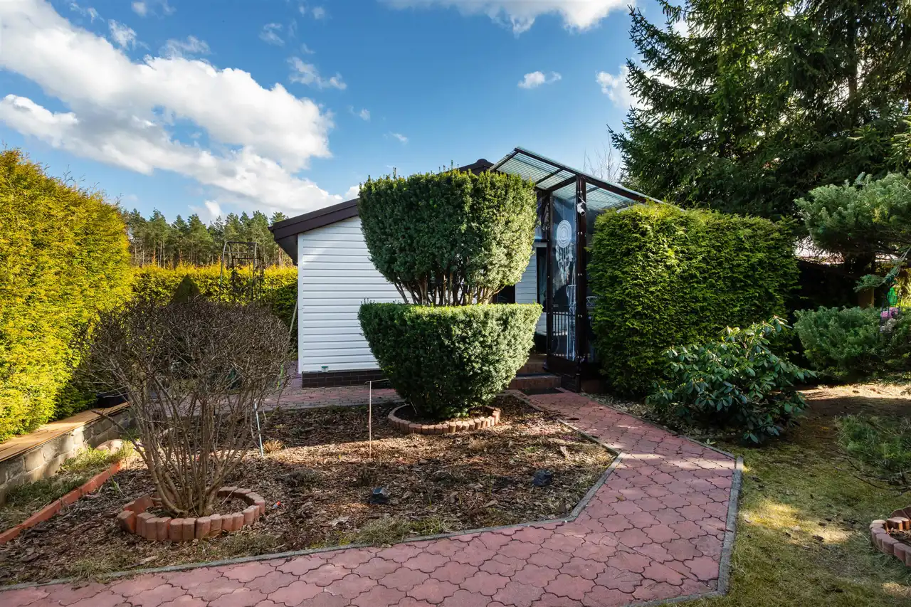 Działka jest ładnie zagospodarowana, z licznymi wieloletnimi drzewami i krzewami.
