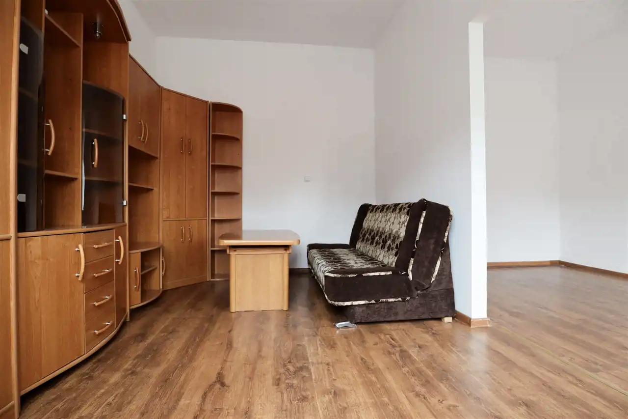 Lokal składa się z przestronnego pokoju przedzielonego ścianką (dzięki czemu powstały dwa funkcjonalne pomieszczenia), aneksu kuchennego oraz łazienki.