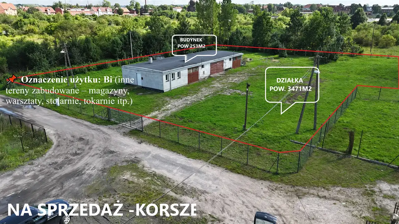 📍 Lokalizacja: tylko 300 m od centrum Korsz. Spokojna okolica z podobną zabudową usługowo-przemysłową.