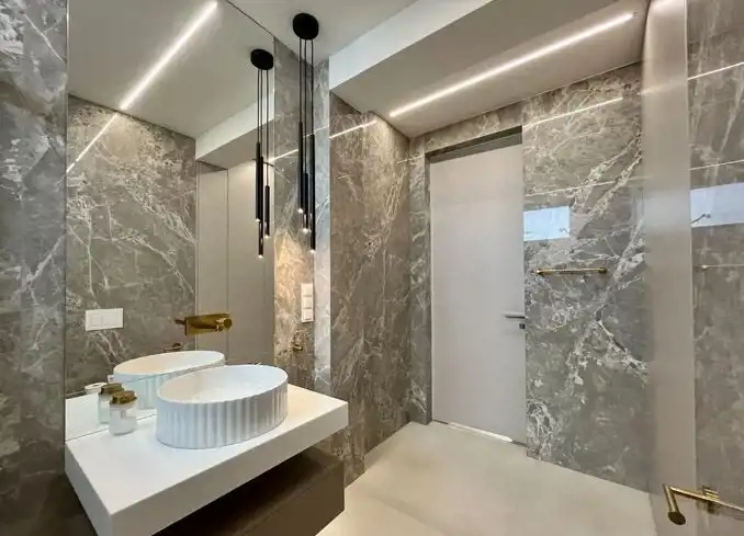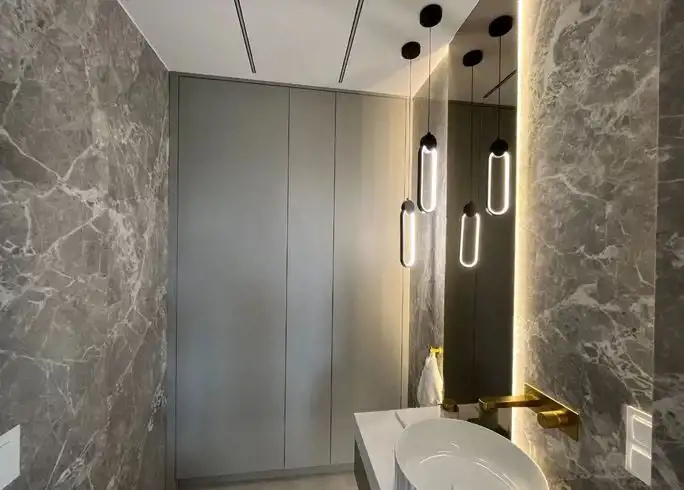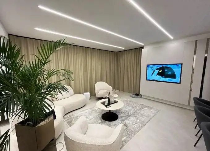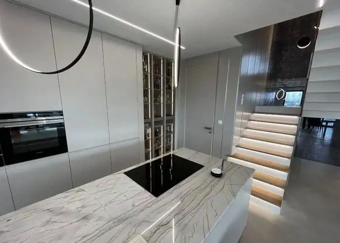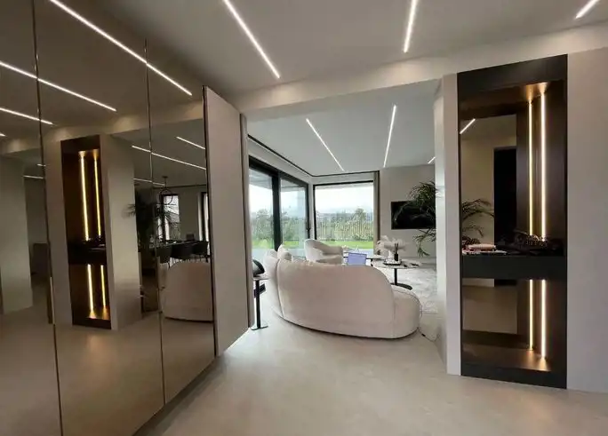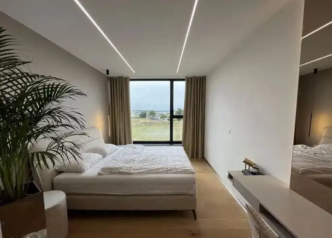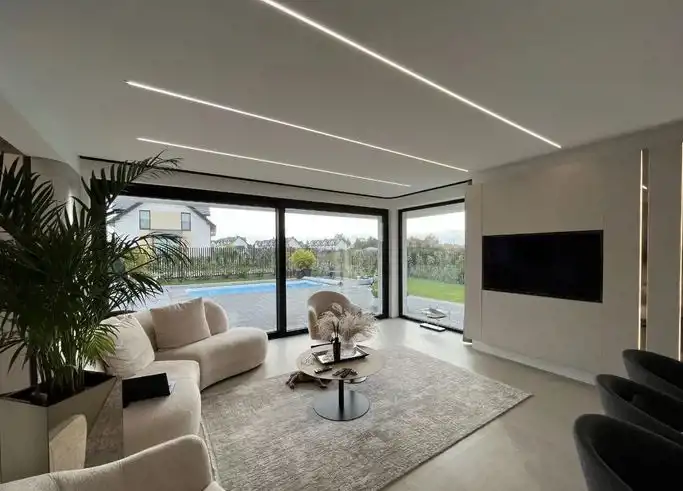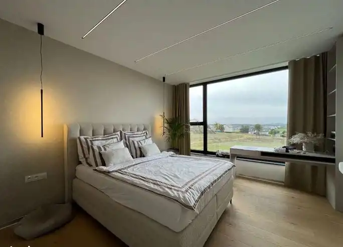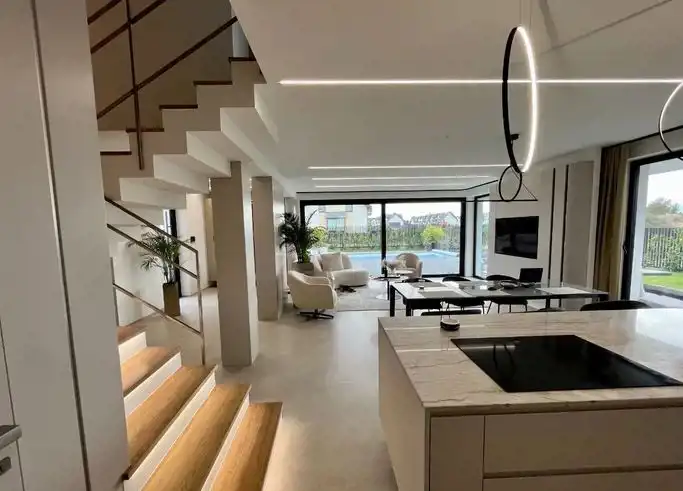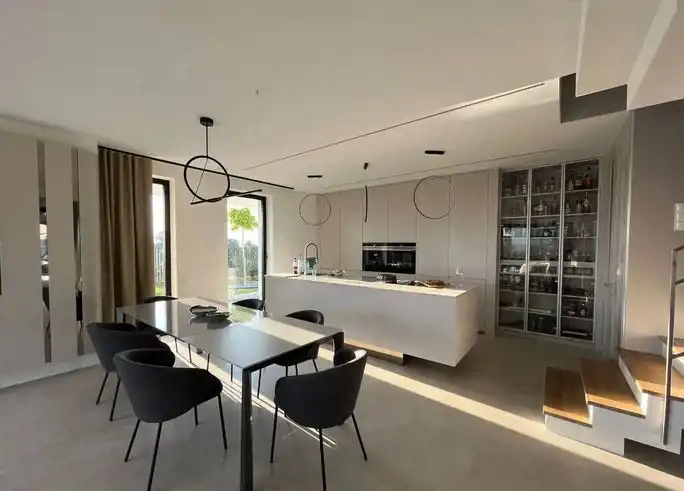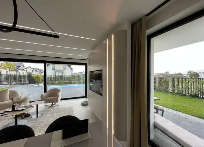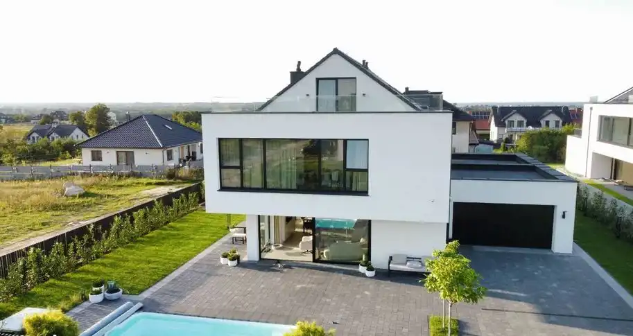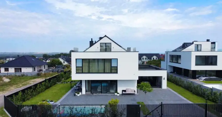 Piętrowy bliźniak został wykończony i wyposażony przy użyciu najwyższej jakości materiałów oraz produktów. Nowoczesne wnętrze doskonale wkomponowane w modernistyczny styl budynku zachwyca klasą i ponadczasowym doborem kolorów. Połączenie bieli, kremów z kontrastującymi szarościami i czerni to kwintesencja elegancji. Nieruchomość wypełniono meblami marki KLER i sprzętami z najwyższej półki. Wysokie, panoramiczne okna doświetlają wnętrza, optycznie je powiększając. Dom to wizytówka luksusu i prestiżu, a jednocześnie enklawa ciszy i spokoju nieopodal doskonale rozwiniętej infrastruktury Trójmiasta.