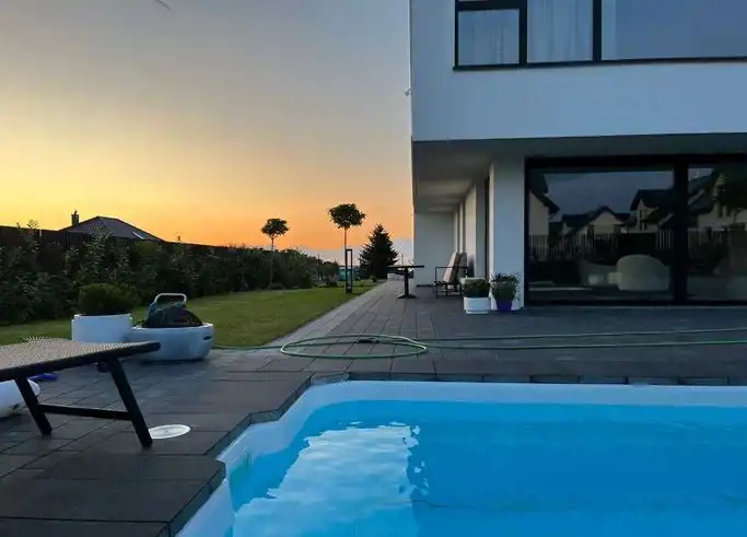 Nieruchomość to połowa piętrowego bliźniaka na działce o powierzchni 500 m w cichej, spokojnej okolicy. Budynek zbudowany z cegły z aluminiowymi oknami, dach pokryty dachówką. Wnętrze ogrzewa pompa ciepła. Do domu przylega zagospodarowany ogród z tarasem oraz basenem. W budynku funkcjonuje system alarmowy.