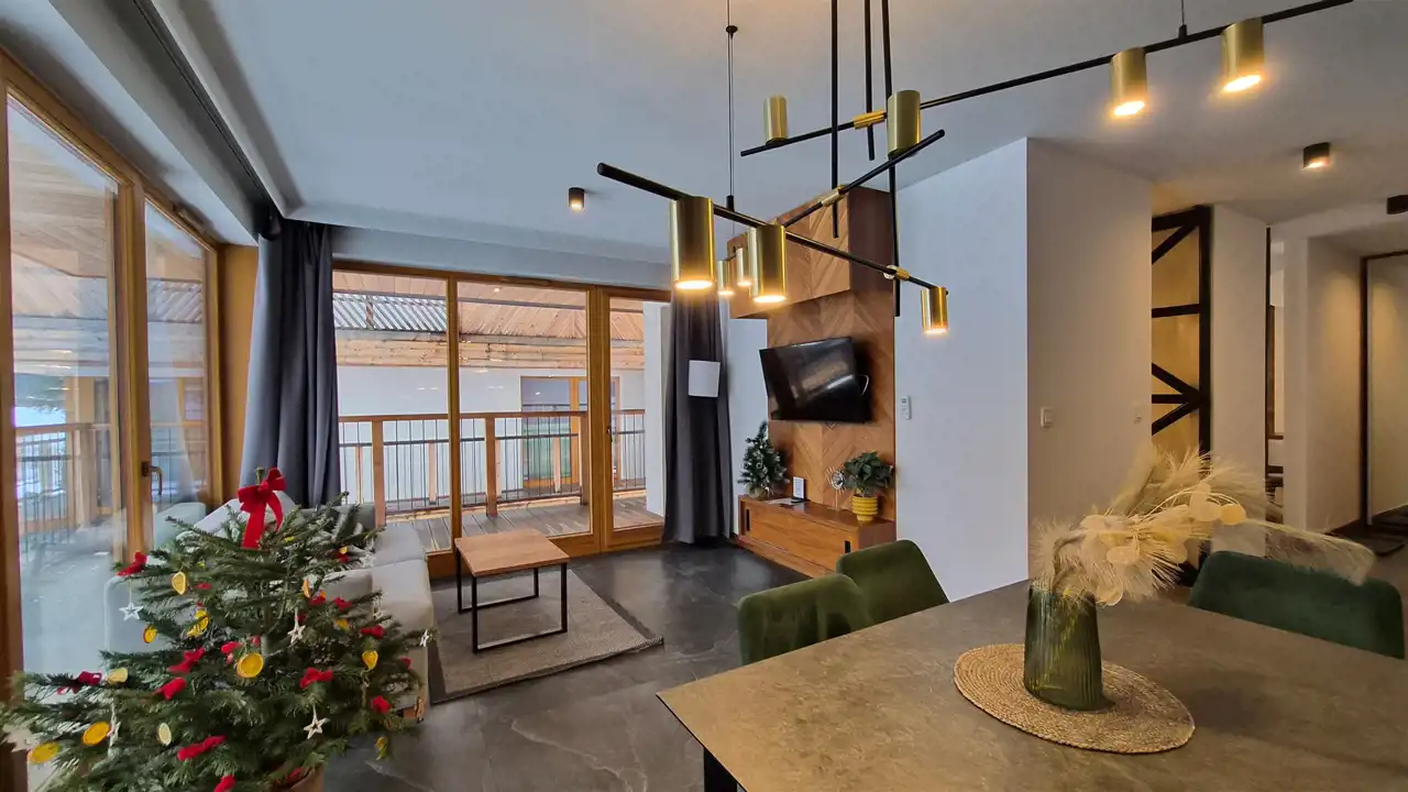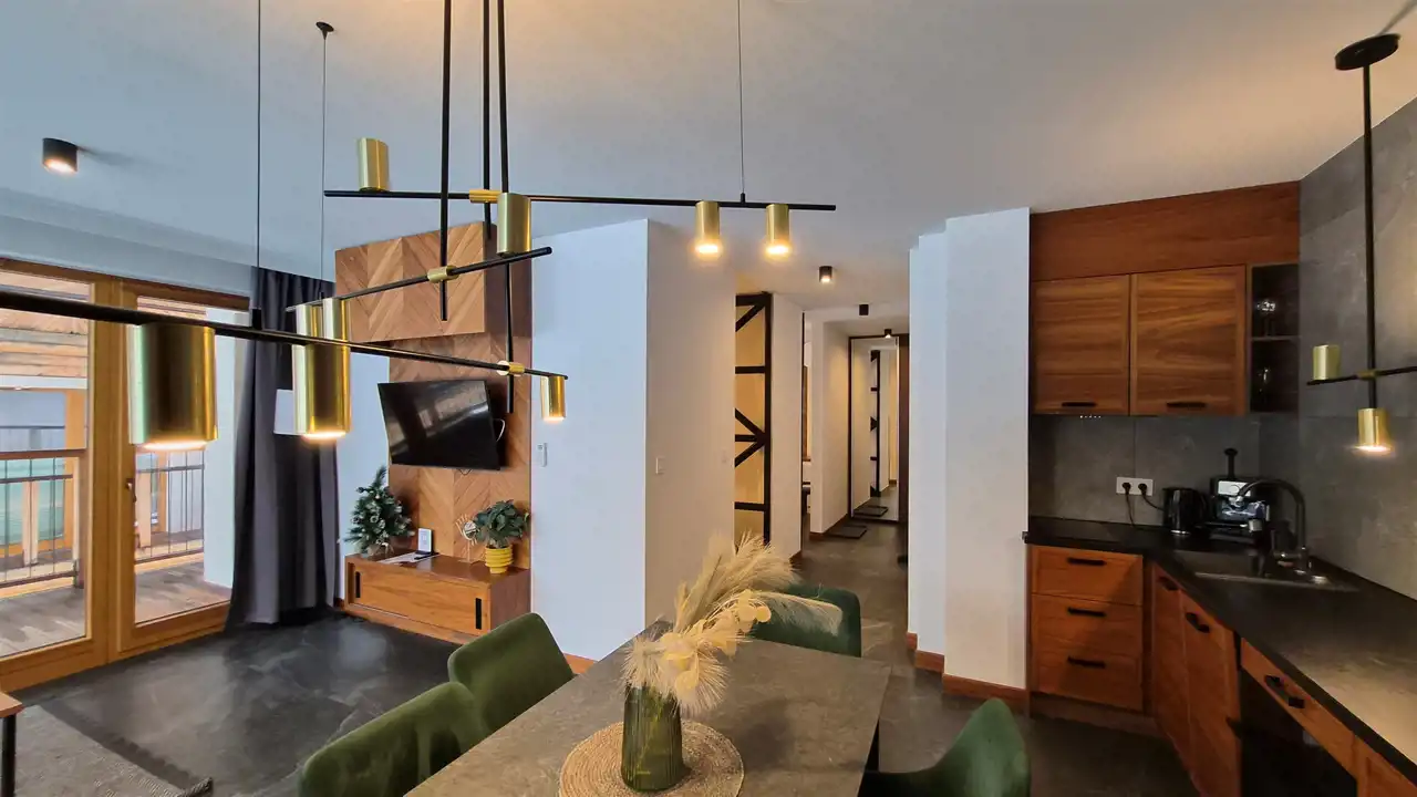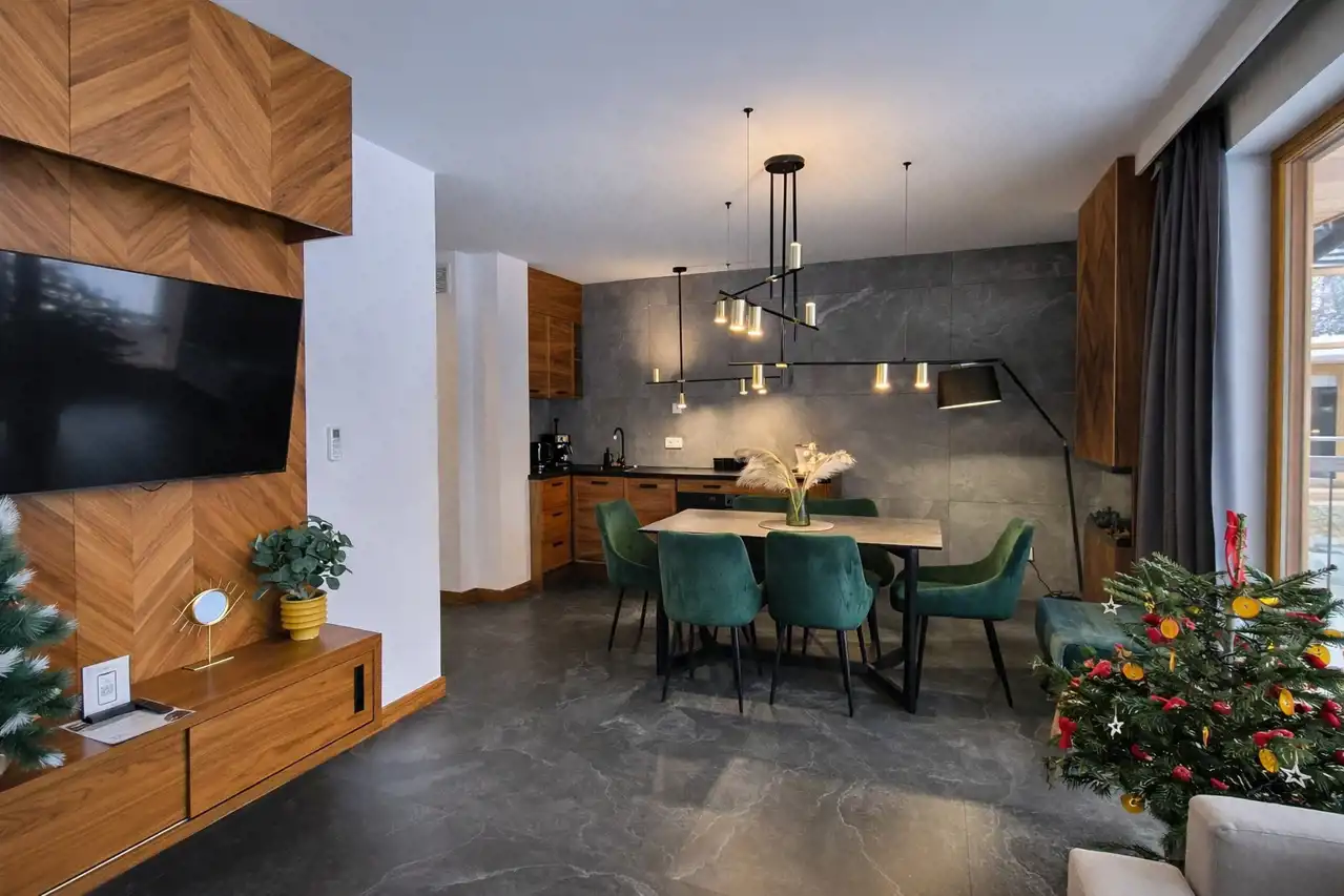 Z tarasu i części dziennej rozciąga się widok na Tatry, co znacząco podnosi atrakcyjność apartamentu w najmie krótkoterminowym.