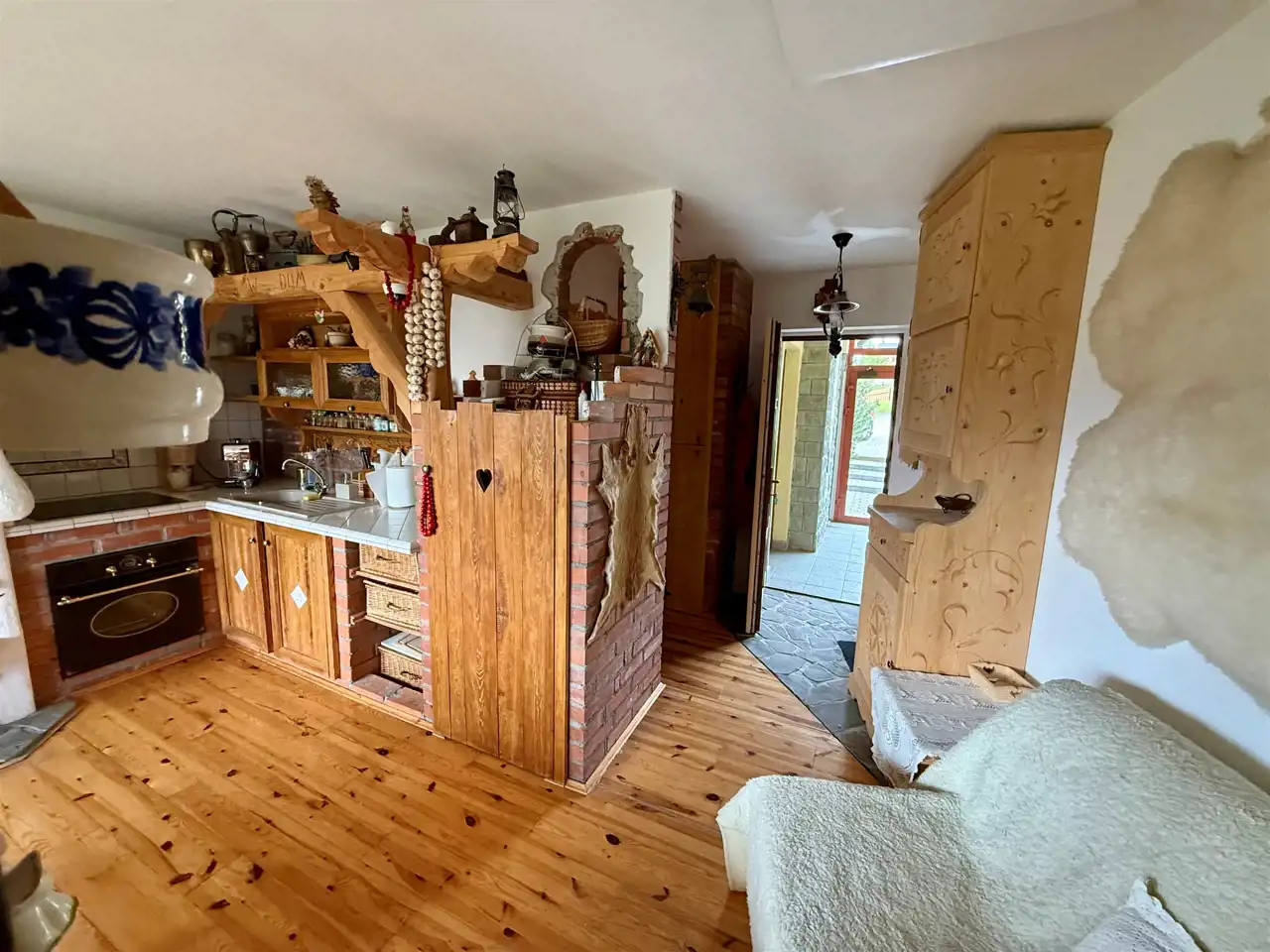Wnętrze zostało zaprojektowane z dbałością o każdy detal – meble wykonane ręcznie przez lokalnego rzeźbiarza tworzą niepowtarzalny klimat. W salonie znajduje się przytulny kominek, który dodaje ciepła i charakteru, a aneks kuchenny oraz wygodne łoże tworzą komfortową przestrzeń do życia lub wypoczynku.