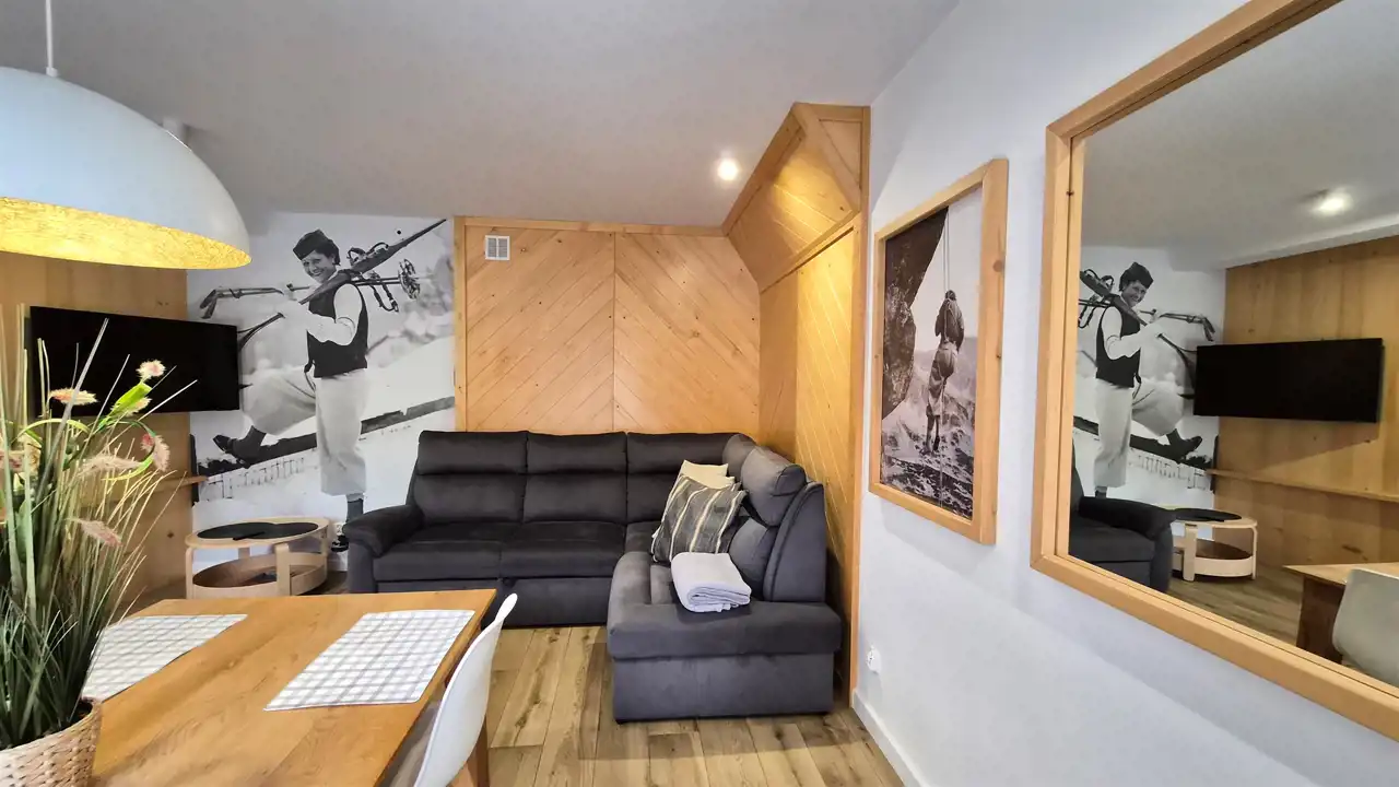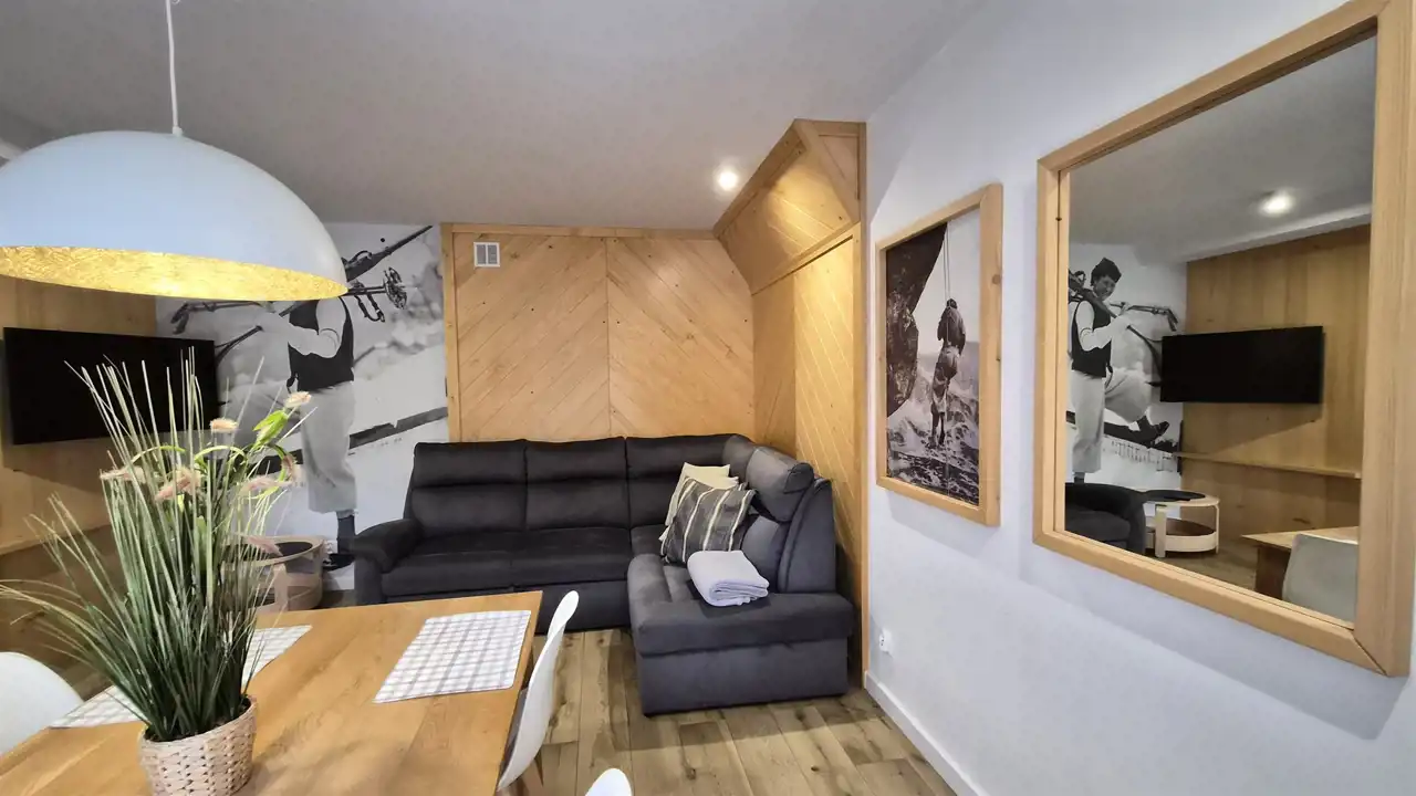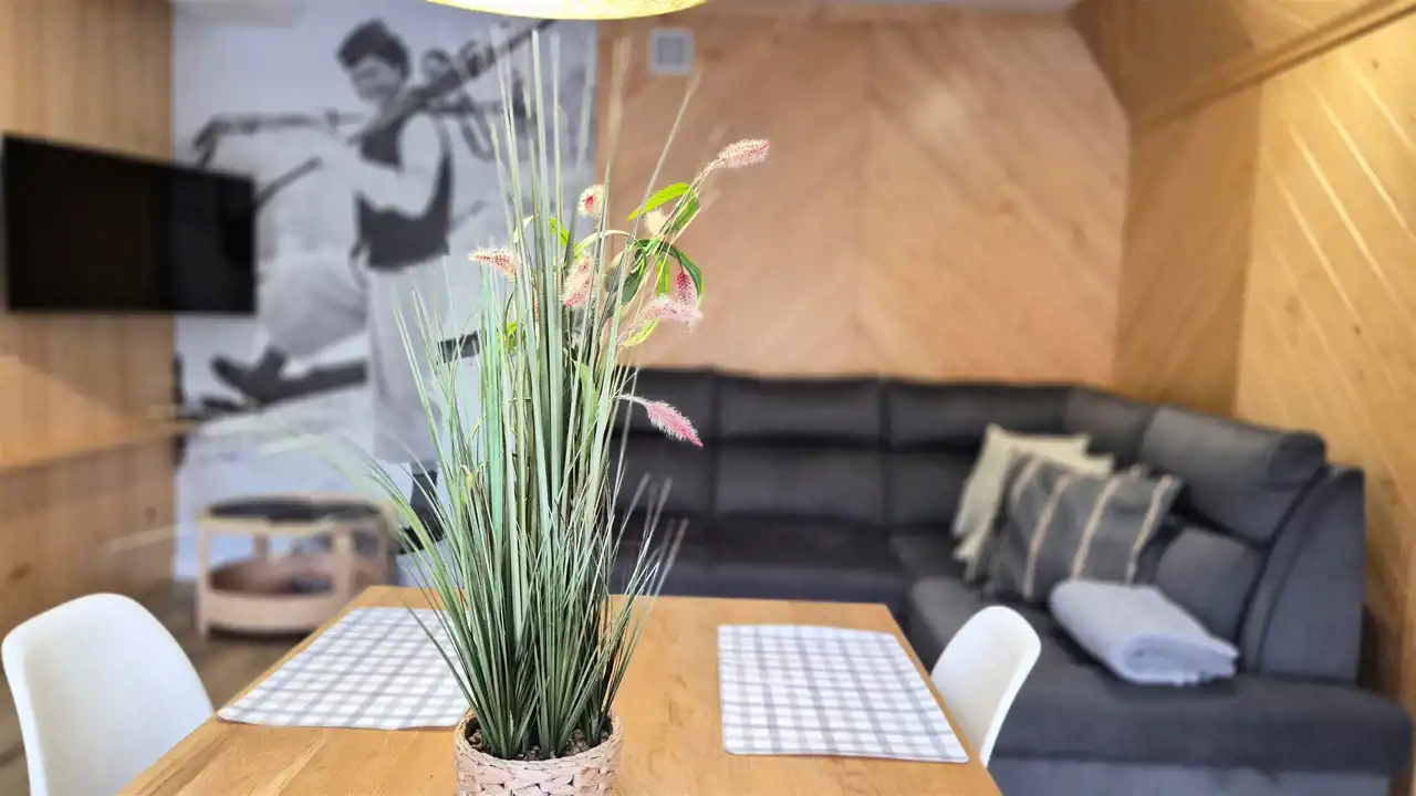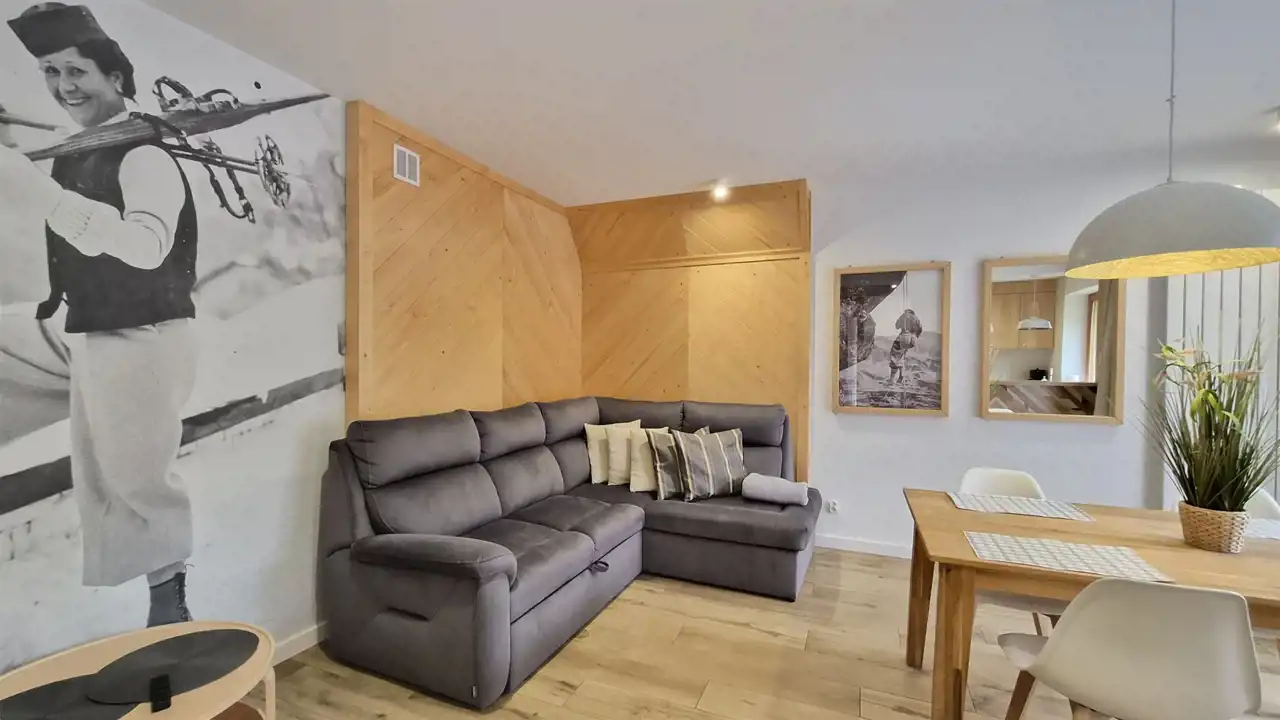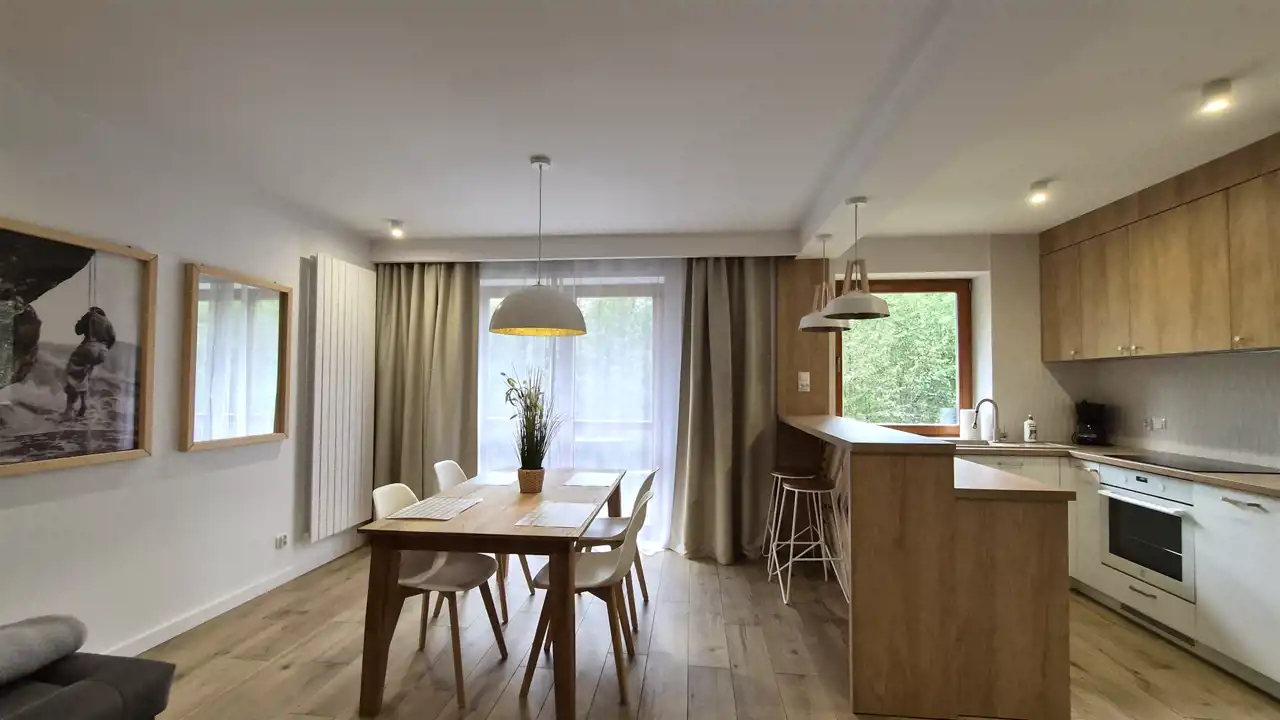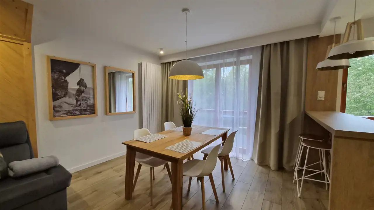 Przestronny salon z częścią jadalnianą i aneksem kuchennym, z bezpośrednim wyjściem na balkon z widokiem na góry