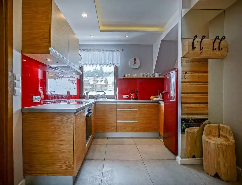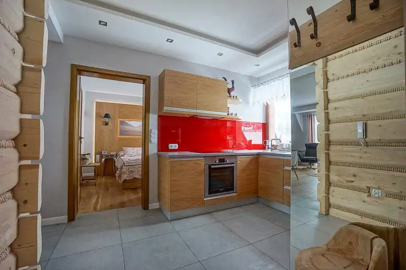 - Przestronny salon z aneksem kuchennym – przestronna i jasna część dzienna z wyjściem na balkon, z którego rozciąga się zapierający dech w piersiach widok na Tatry. Idealne miejsce do relaksu.